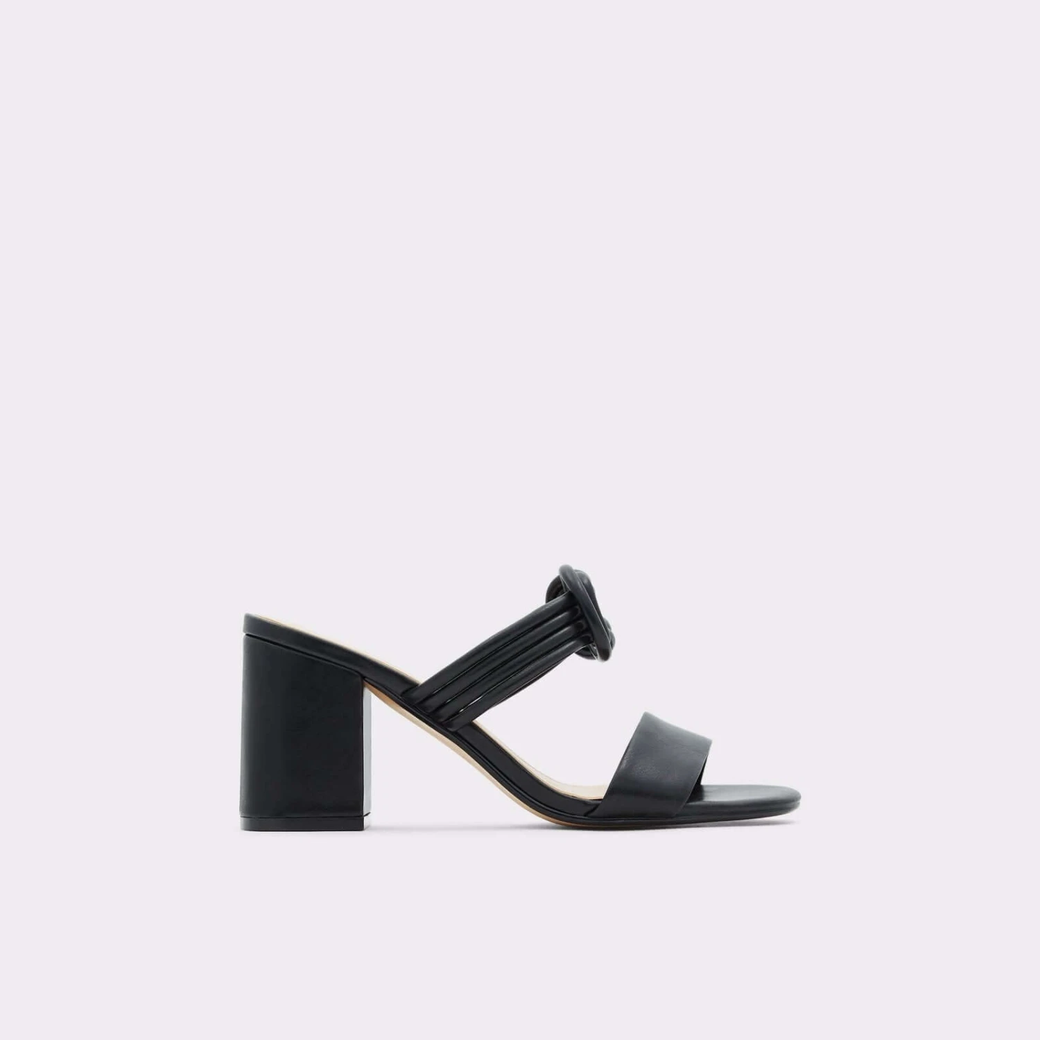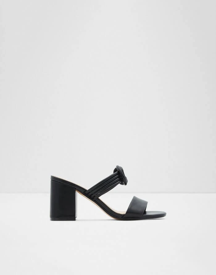 #Style notes *Block heel slip on sandals with a delicate knot on the upper strap. Time to show off your toes and set them free for warmer days. This minimalist double strap mule is the perfect wear and go. #Details * High heel mule * Round toe * Block heel * Slip on * Knot detail * Colour Black #Materials *Upper: Synthetic *Sole: Rubber #Measurements *Heel height: 7.5 cm