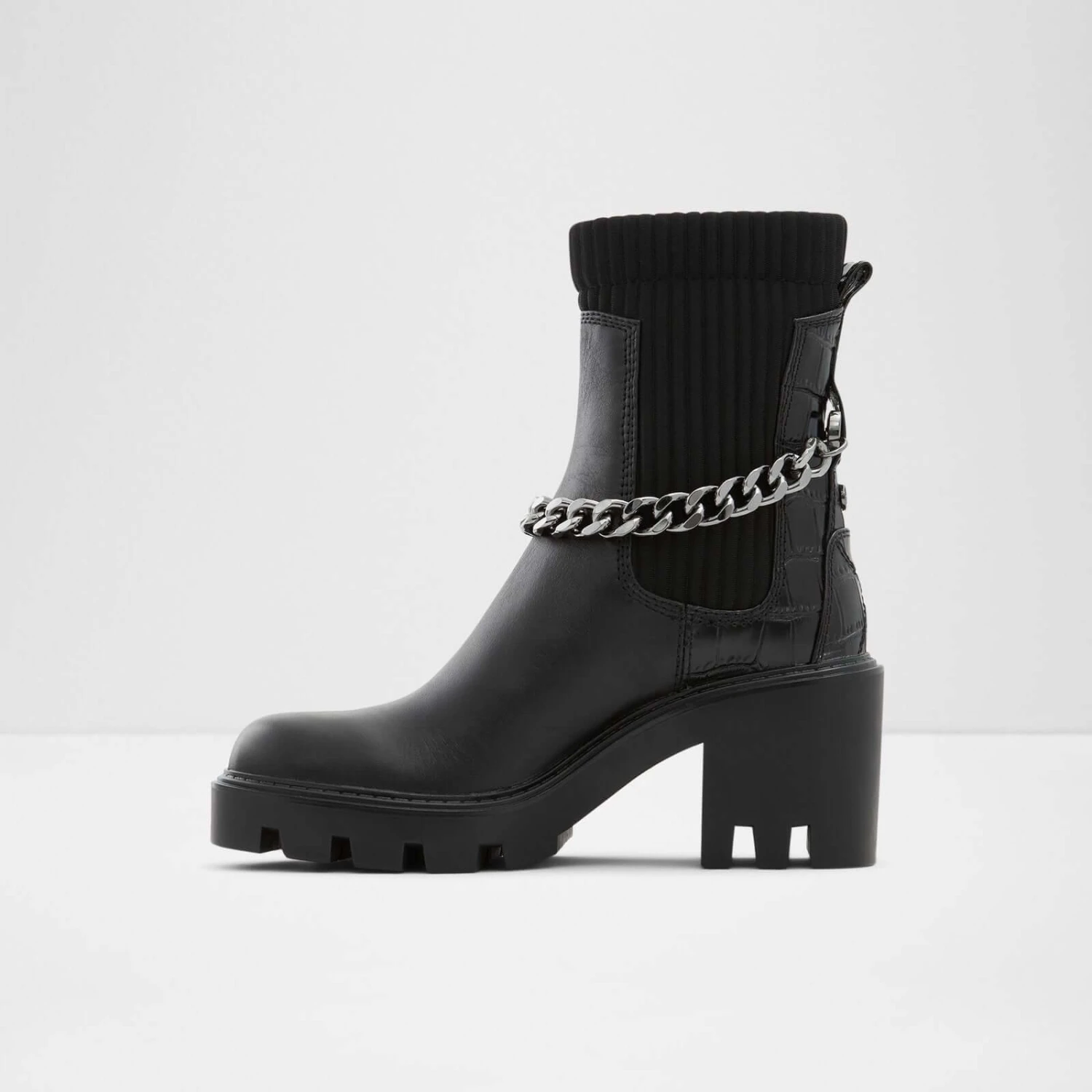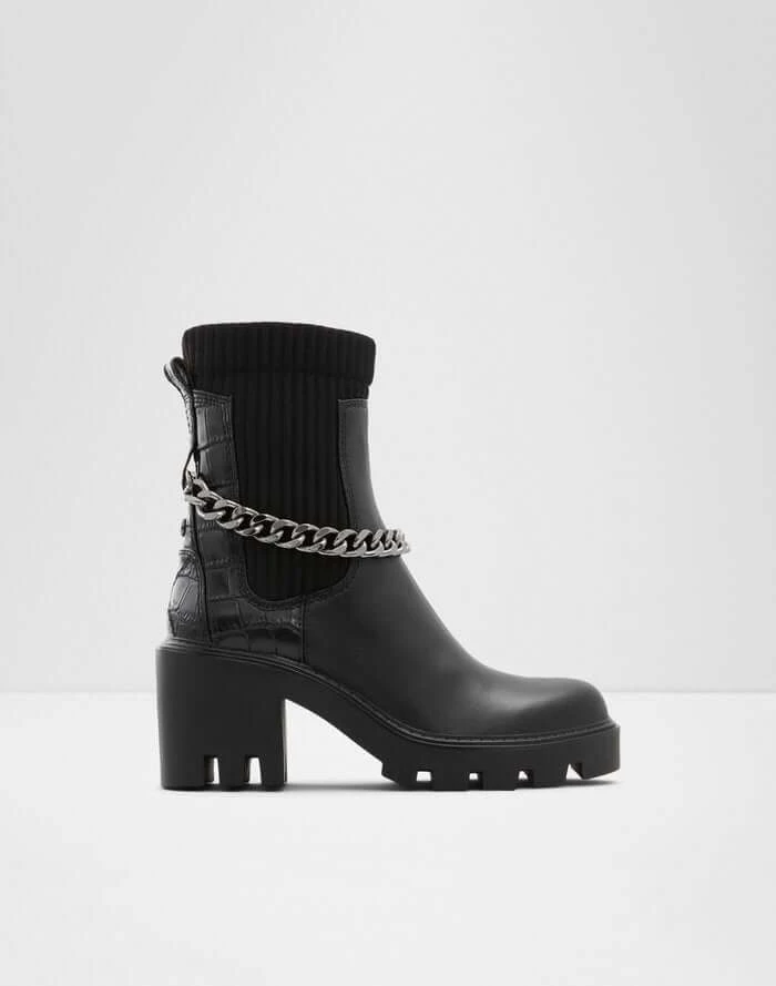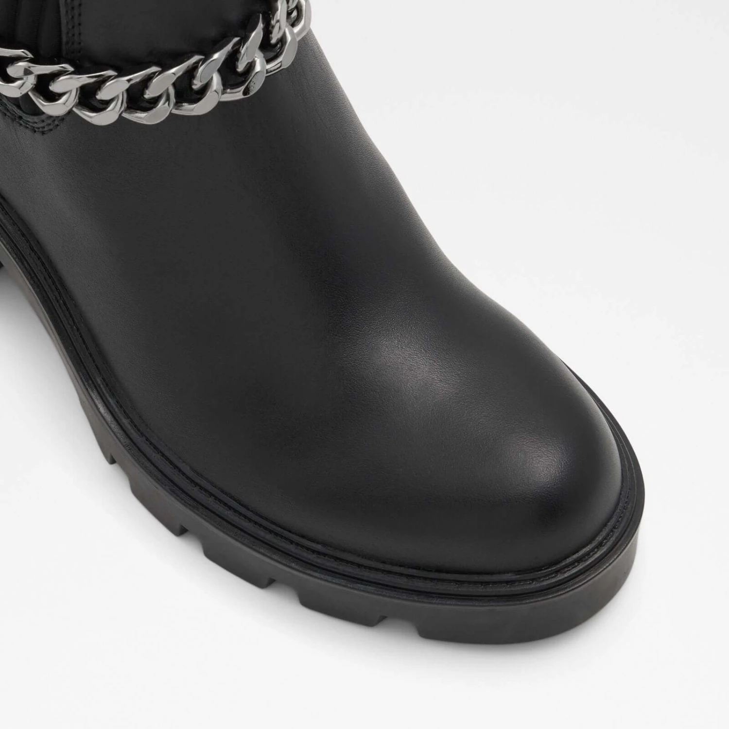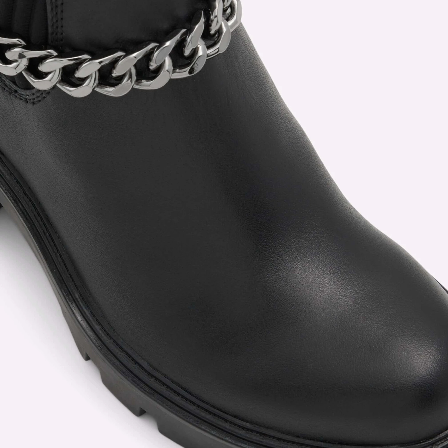 #Style notes * #Details * Chelsea boot * Round toe * Lug sole * Slip on * Decorative chains * Colour Black #Materials *Upper: Leather *Sole: Rubber #Measurements *Heel height: 2.75 inches *Shaft Height: 6.25 inches