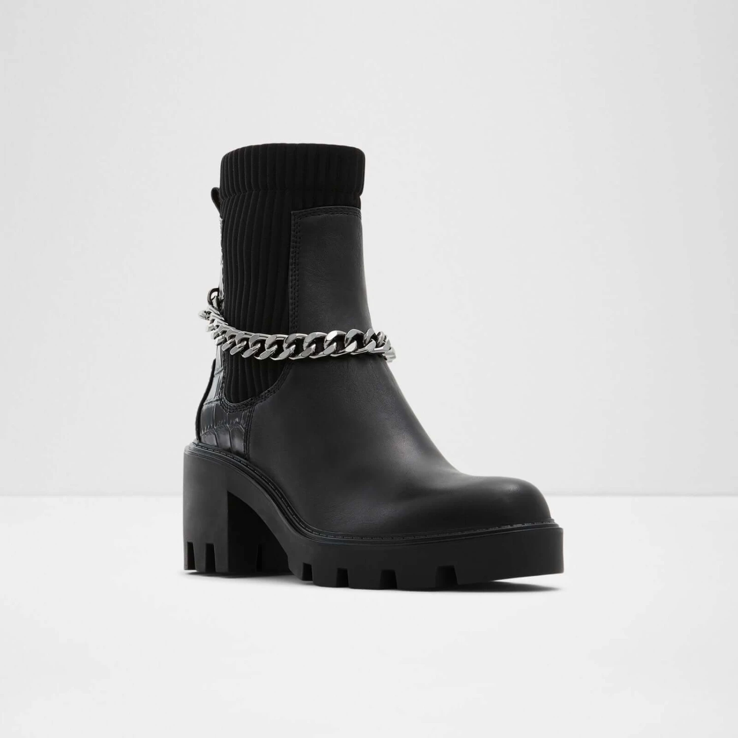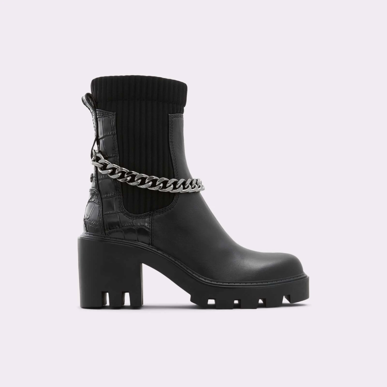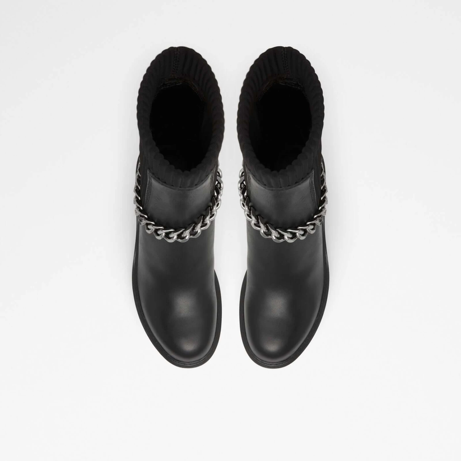 #Style notes * #Details * Chelsea boot * Round toe * Lug sole * Slip on * Decorative chains * Colour Black #Materials *Upper: Leather *Sole: Rubber #Measurements *Heel height: 2.75 inches *Shaft Height: 6.25 inches