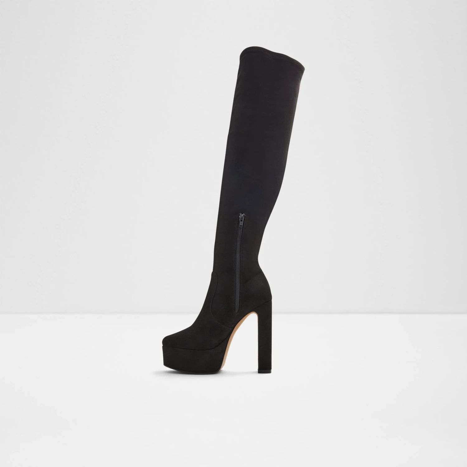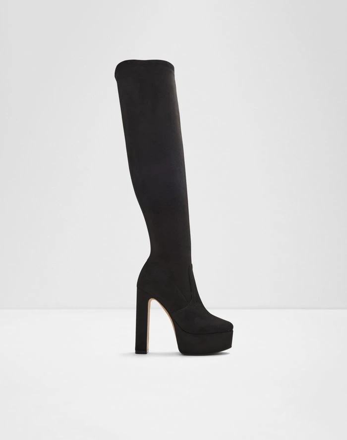 #Style notes *Prepare to command all the attention with these towering over-the-knee boots designed with a striking block heel. #Details * Over-the-knee boot * Closed almond toe * Flatform * Slip-on * Colour Black #Materials *Upper: Textile *Main: Microfiber *Sole: Rubber #Measurements *Heel height: 5.25 cm *Platform height: 1.5 cm *Shaft Height: 21.0 cm *Circumference: 15.0 cm