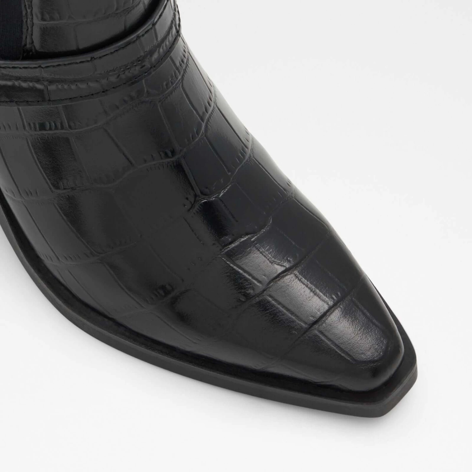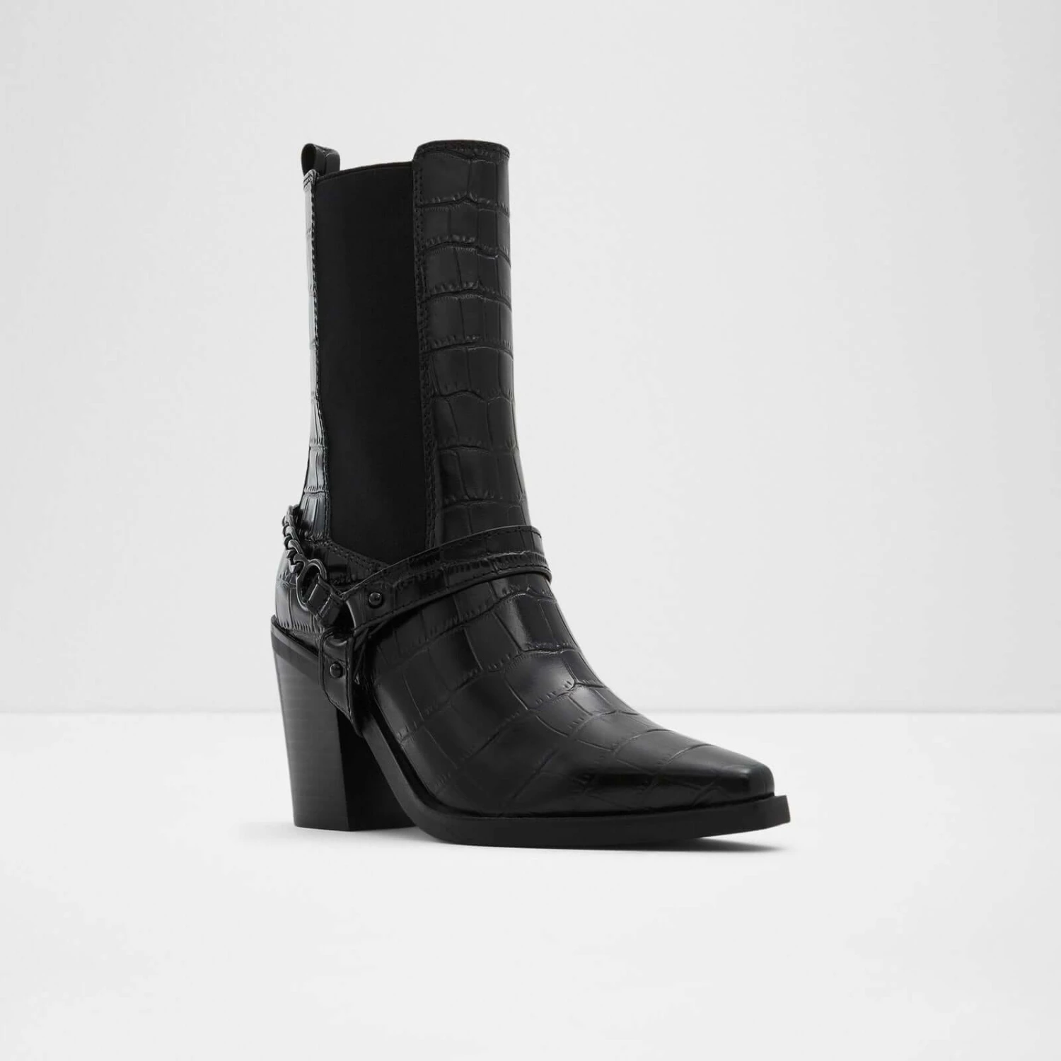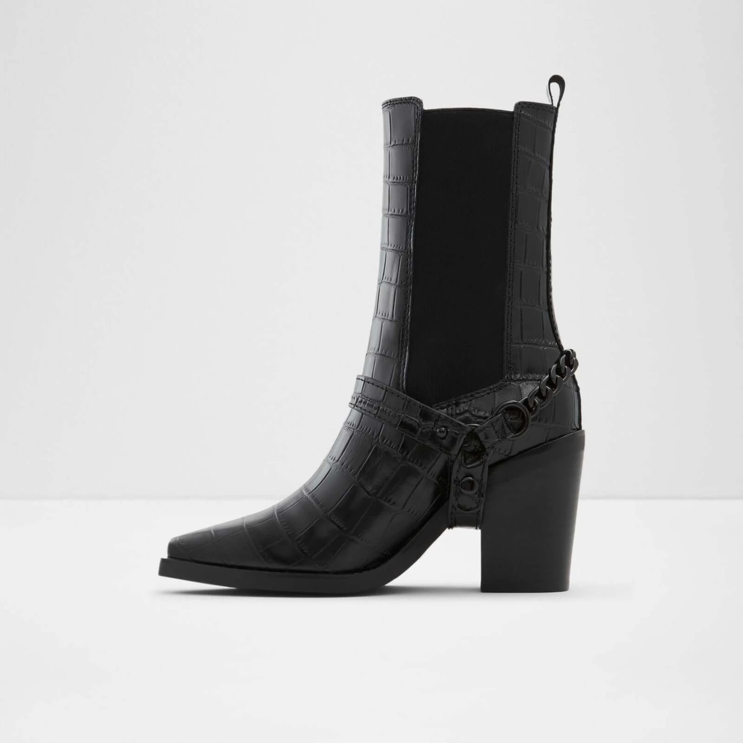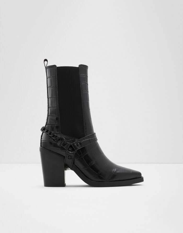 #Style notes * #Details * Western ankle boot * Square toe * Block heel * Slip on * Decorative chains * Colour Black #Materials *Upper: Leather *Sole: Rubber #Measurements *Heel height: 3.5 inches *Shaft Height: 7.0 inches *Circumference: 10.0 inches