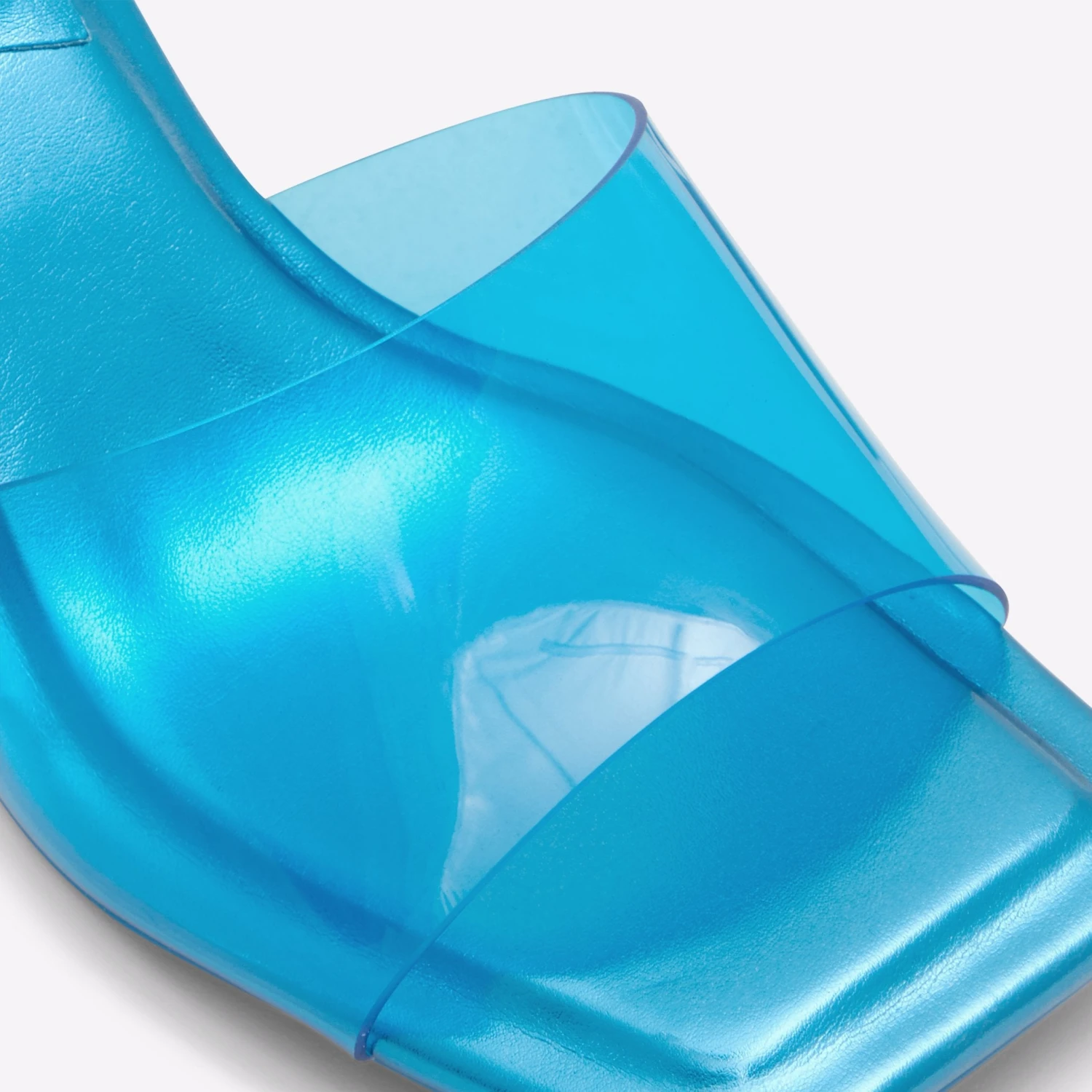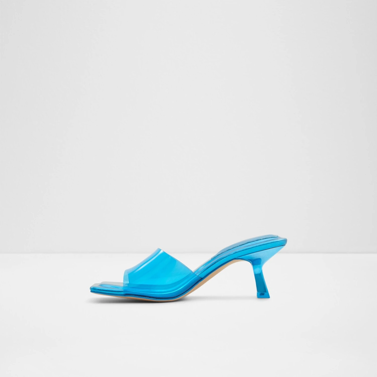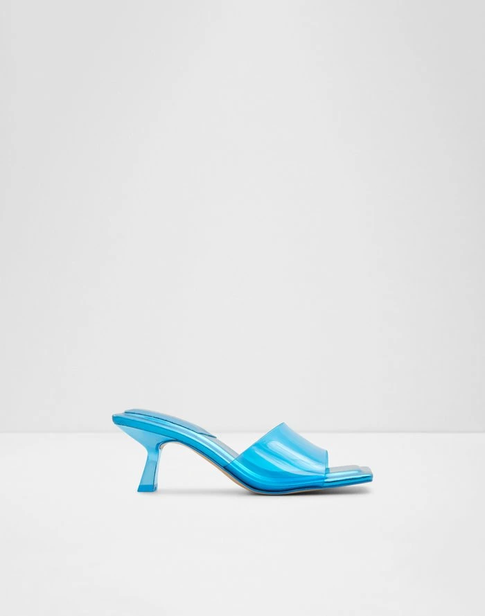 #Style notes *Sculpted kitten heel, bold square toe and comfy padded insoles…These aren’t your basic mules and we’re here for it! #Details * Heeled mule * Open square toe * Stiletto heel * Slip on * Colour Medium Blue #Materials *Upper: Synthetic *Main: Clear *Sole: Rubber #Measurements *Heel height: 6.35 cm