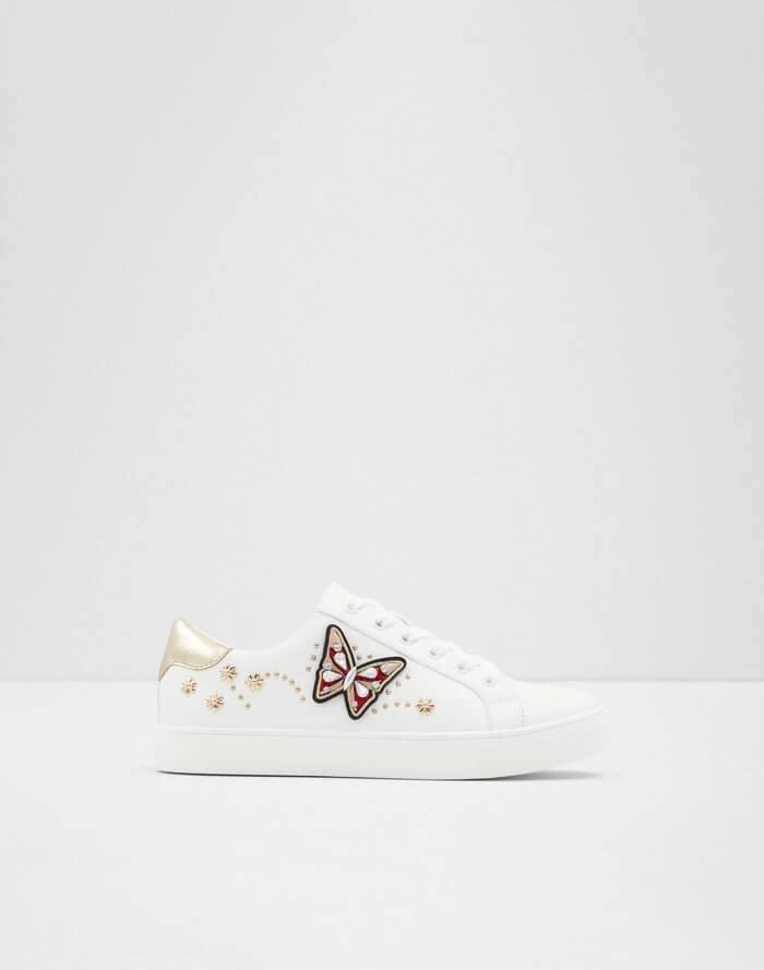 #Style notes *Bold, bright and bedazzled, these white sneakers with patch details are all about embracing love and creativity. They’ll elevate your most classic looks to new heights! #Details * Sneaker * Round toe * Laces closure * Patches detail * Colour White #Materials *Upper: Synthetic *Sole: Rubber