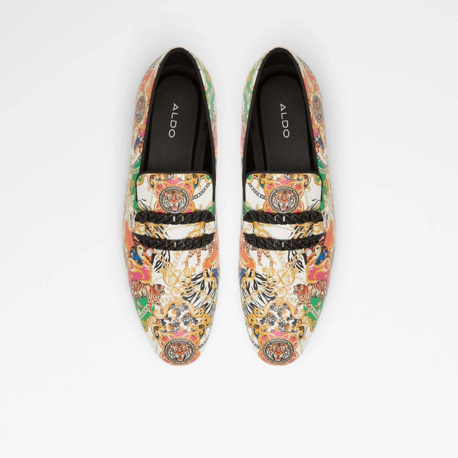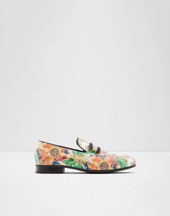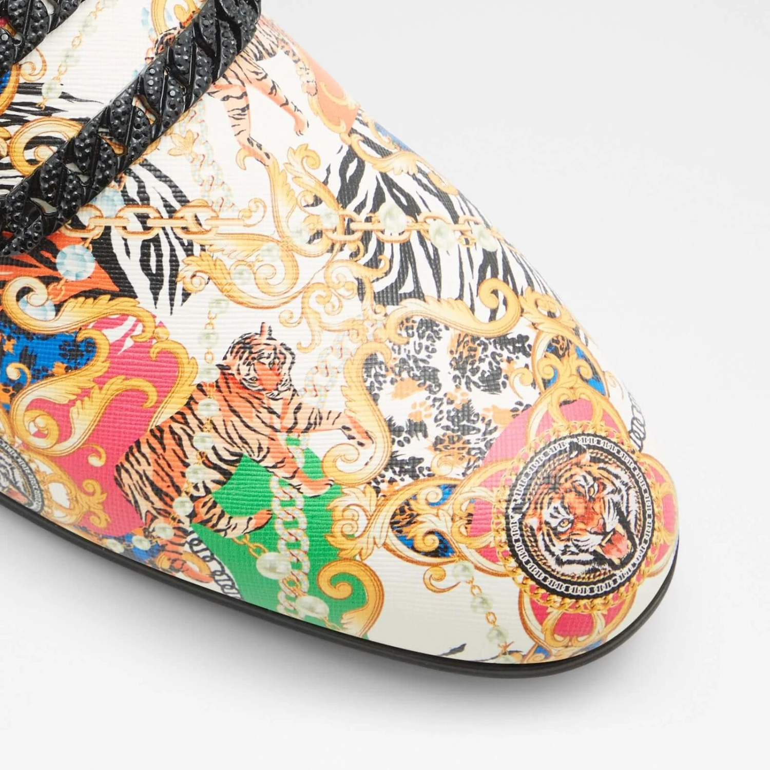 #Style Notes *Slip back to the ’70s in these vintage inspired loafers featuring a gnarly chain detail, tapered almond toe construction, and ultra comfy soles. They’ll be sure to spark some conversations. #Details *Colour: Black Multi *Heel Height: 0.00 In (0.00 Cm) *Heel Type: Flat Or No Heel #Materials *Main Material: Synthetic *Sole Material: Rubber