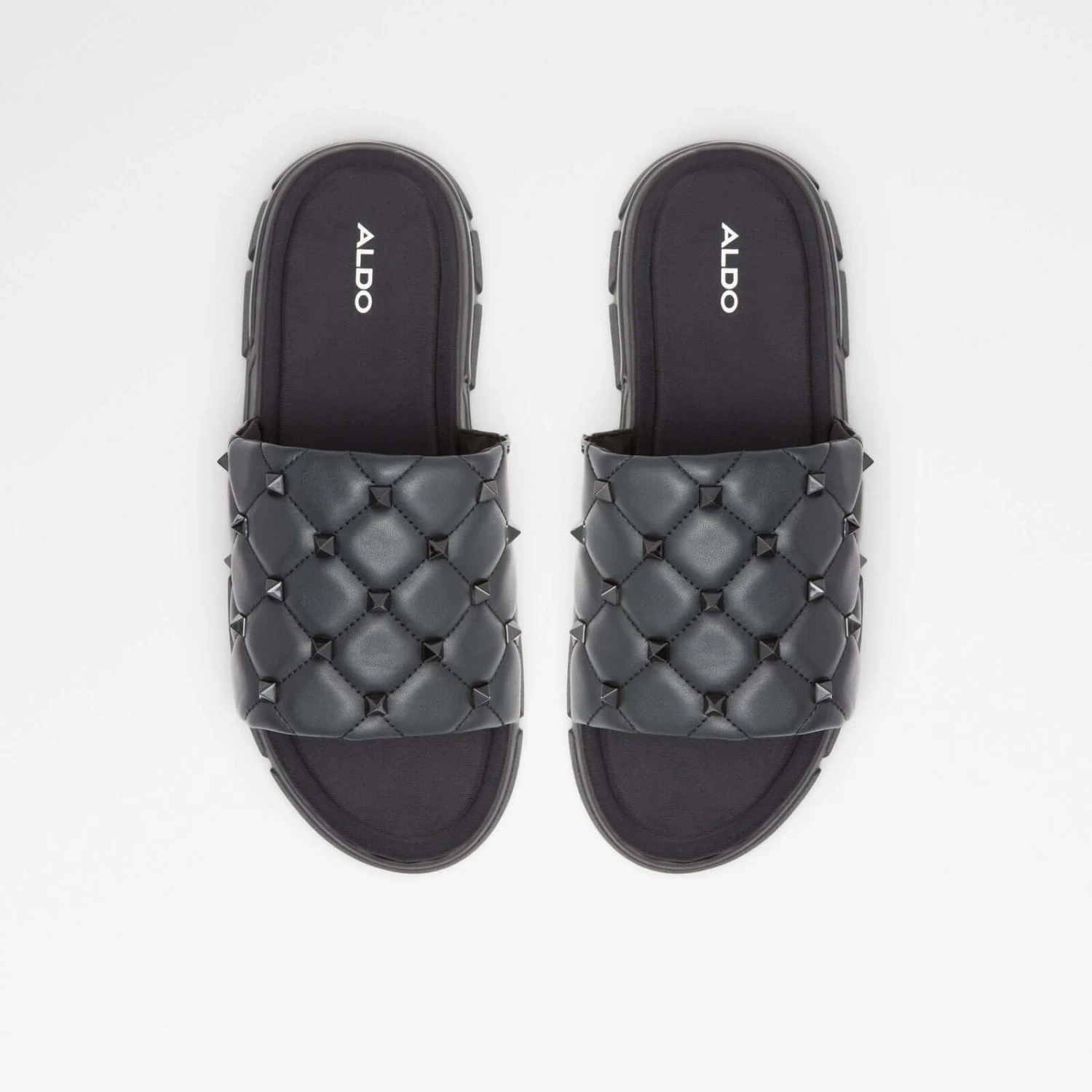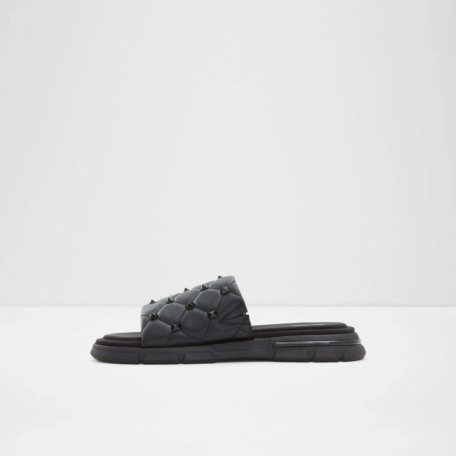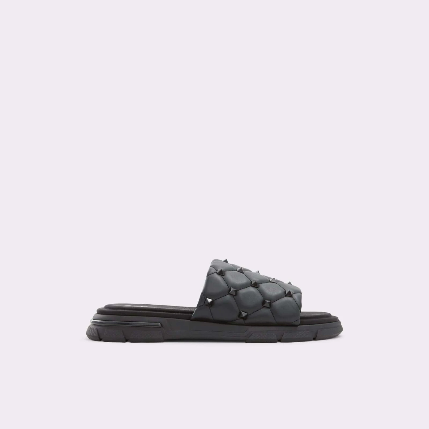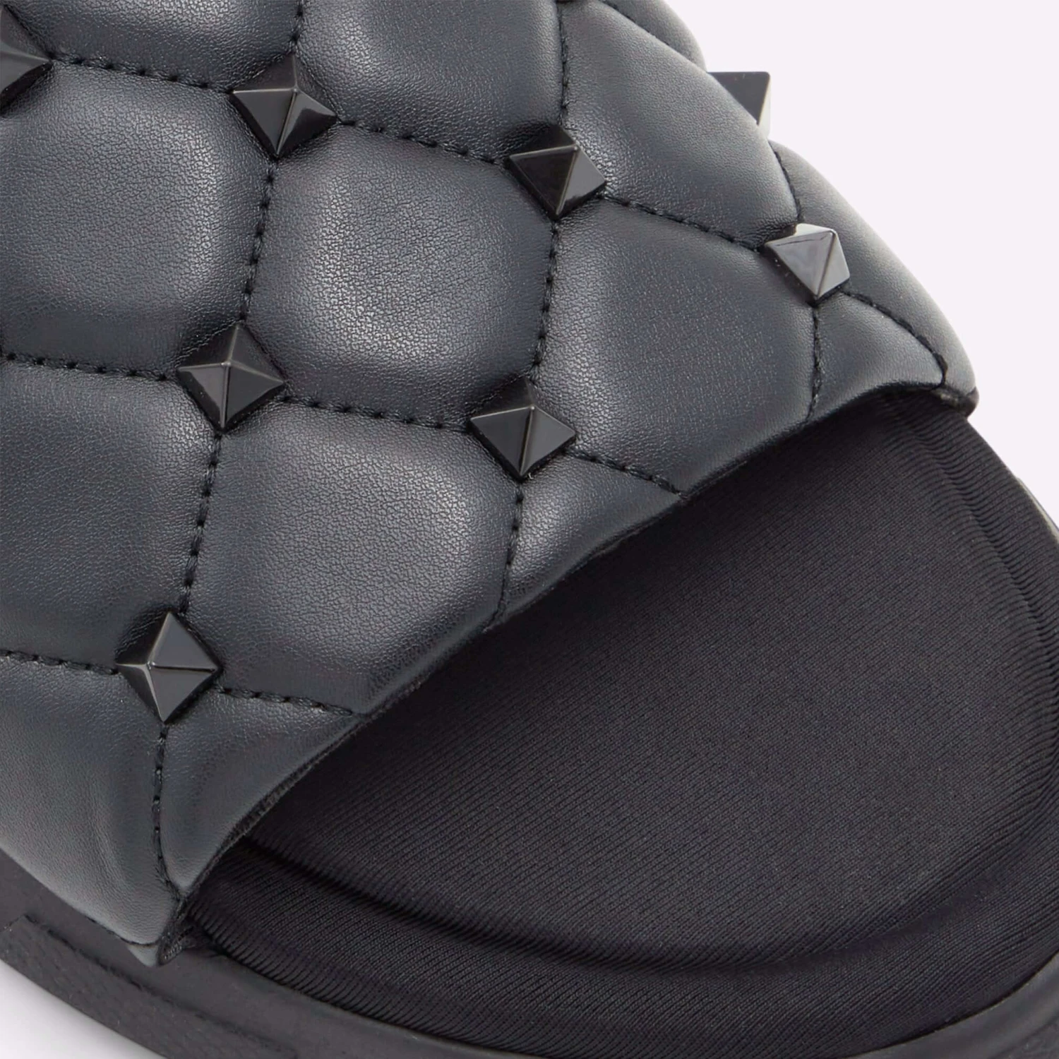 #Style Notes *Stand out in these studded slides. Land right between style and comfort with cushy soles and quilted uppers. Your feet with thank you! #Details *Colour: Black *Heel Height: 0.00 In (0.00 Cm) *Heel Type: Flat Or No Heel #Materials *Main Material: Synthetic *Sole Material: Thermo Plastic Rubber