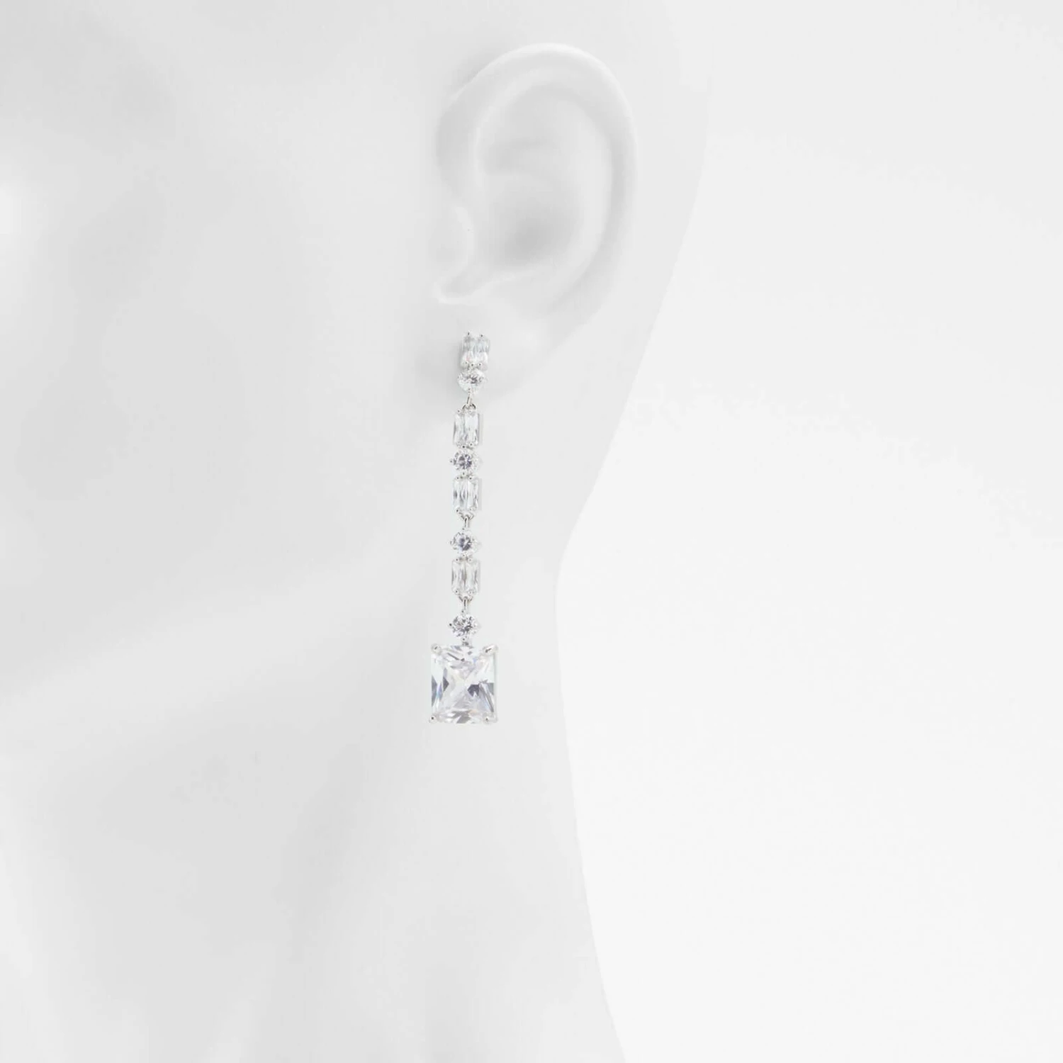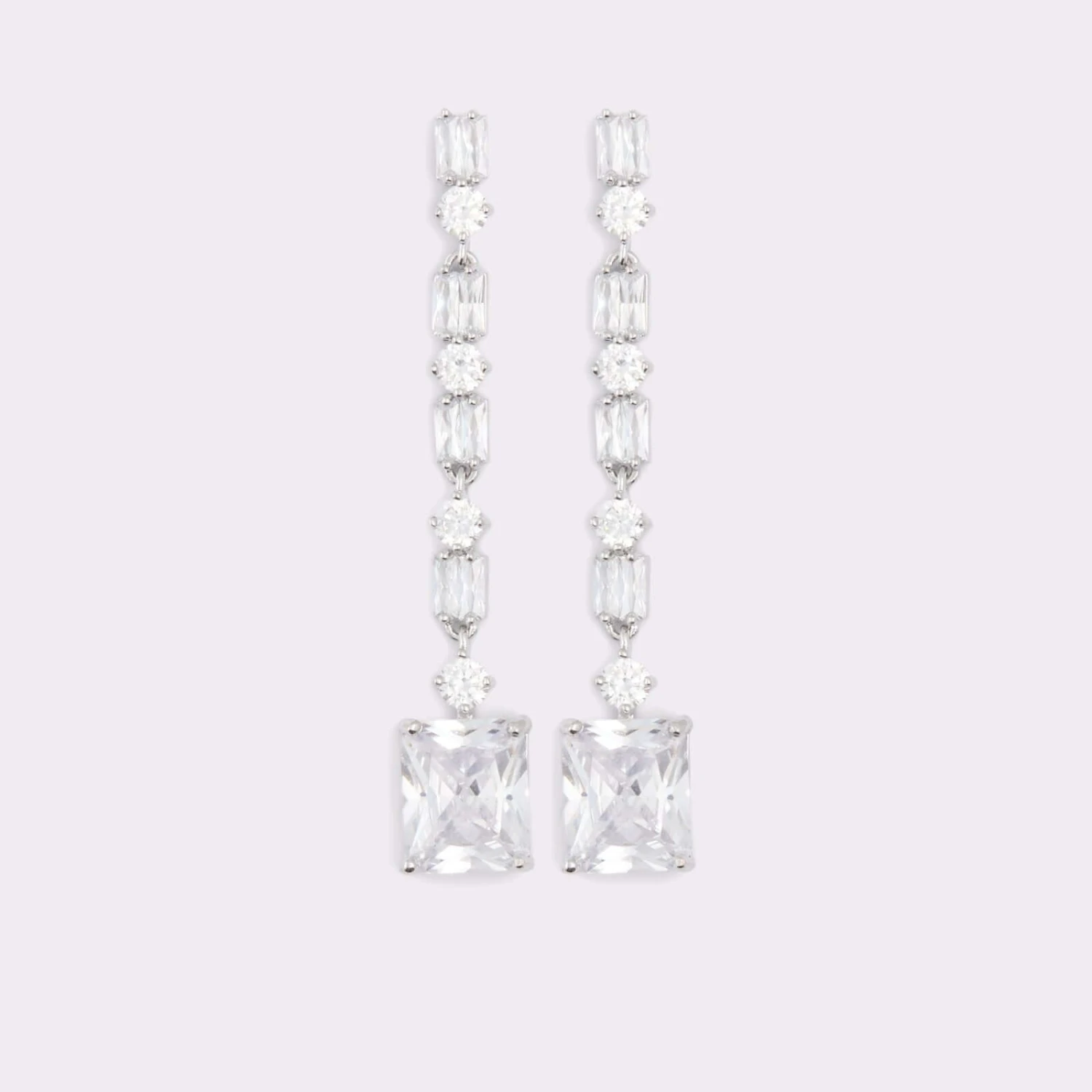 #Style Notes *Get that movie-star vibe going with this dramatic pair of chandelier-style pierced earrings. Silver-tone settings feature a single drop of clear round crystals with a dramatic square-shaped stone dangling just below the jawline. #Details *Colour: Silver/Clear Multi