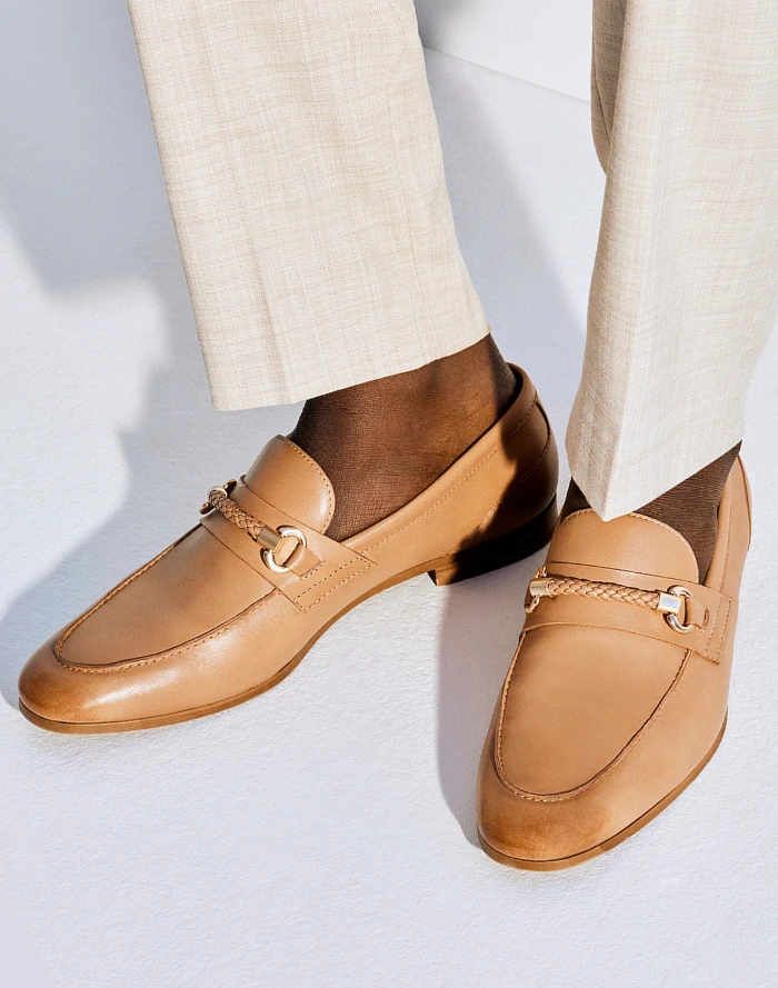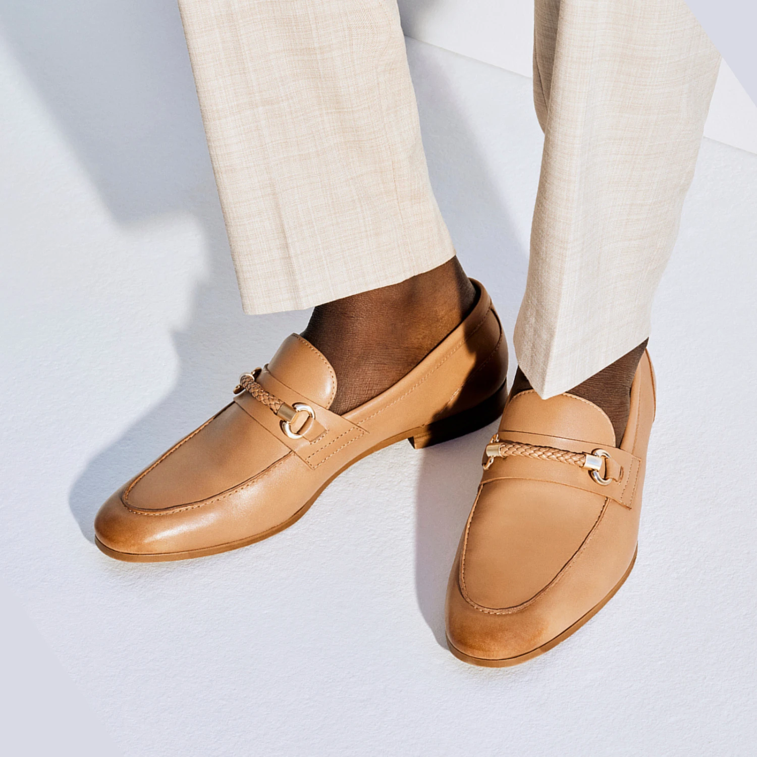 #Style notes * Make moves in our Gento leather loafers featuring a sleek metal detail and a tapered almond toe. #Details * Loafer * Closed almond toe * Slip on * Keeper ornament * Colour Light Brown #Materials *Upper: Leather *Sole: Rubber #Measurements *Heel height: 1.27 cm