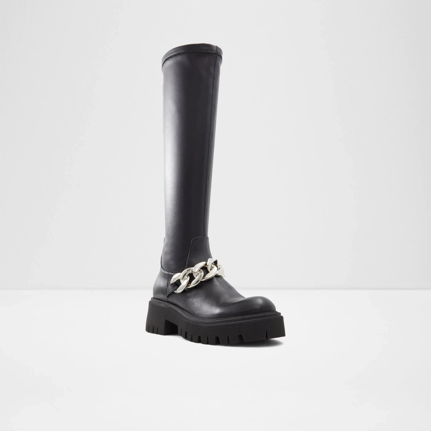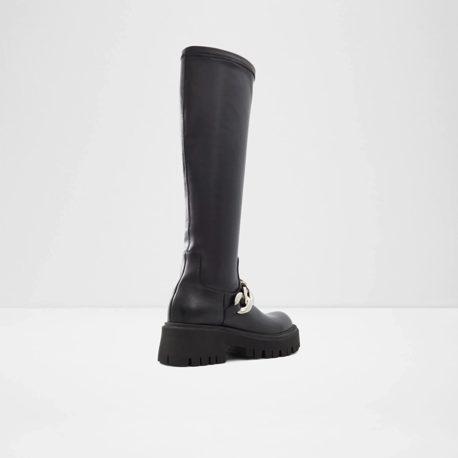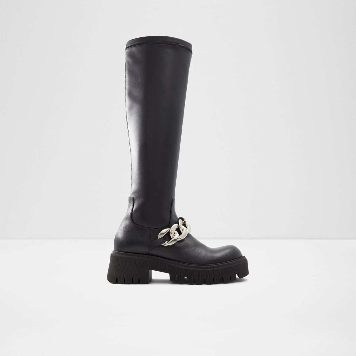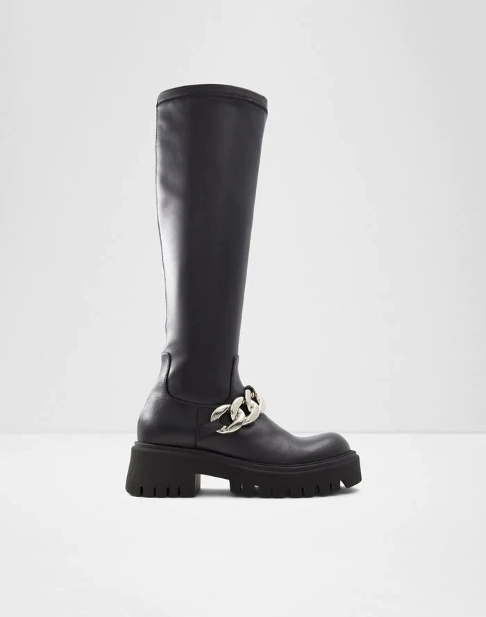 #Style notes * #Details * Round toe * Lug sole * Zipper closure * Decorative chains * Colour Black #Materials *Upper: Synthetic *Sole: Rubber #Measurements *Heel height: 2.25 cm *Platform height: 1.25 cm *Shaft Height: 16.5 cm *Circumference: 14.0 cm
