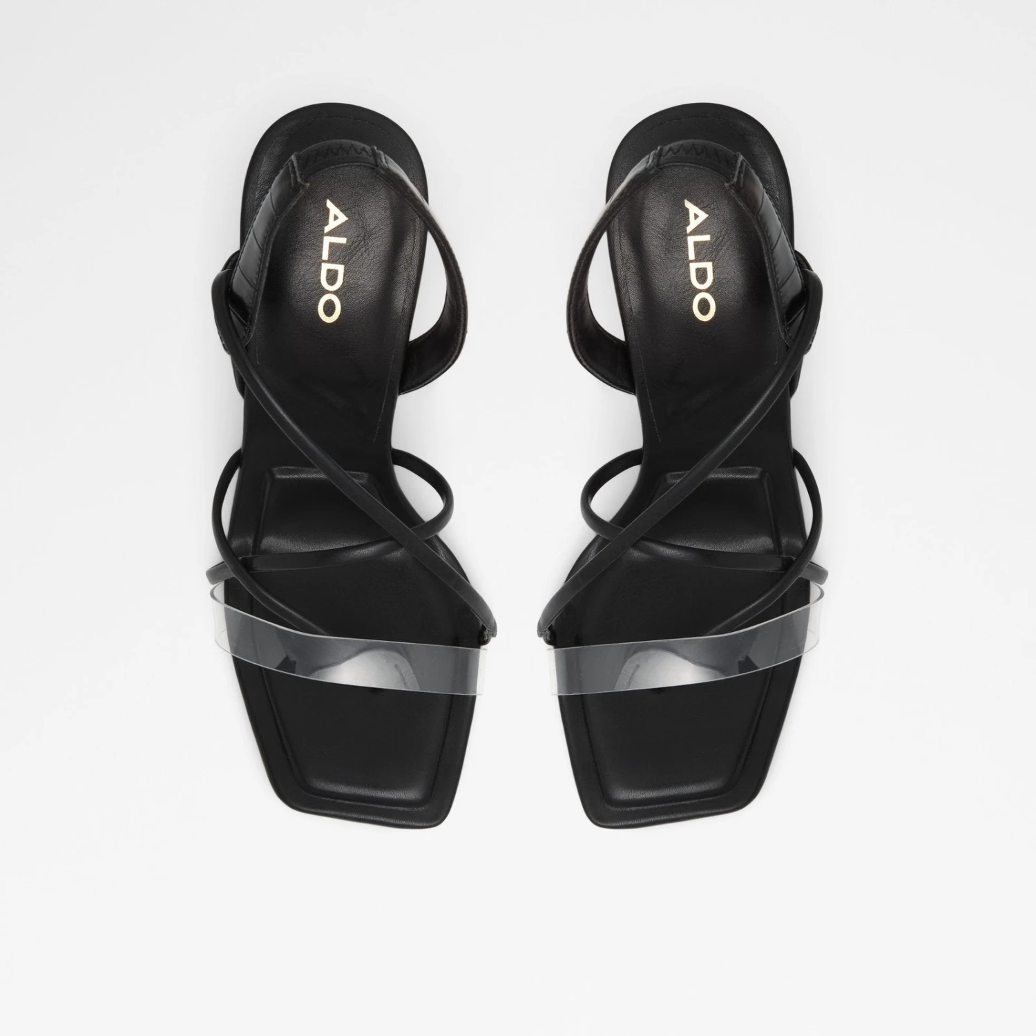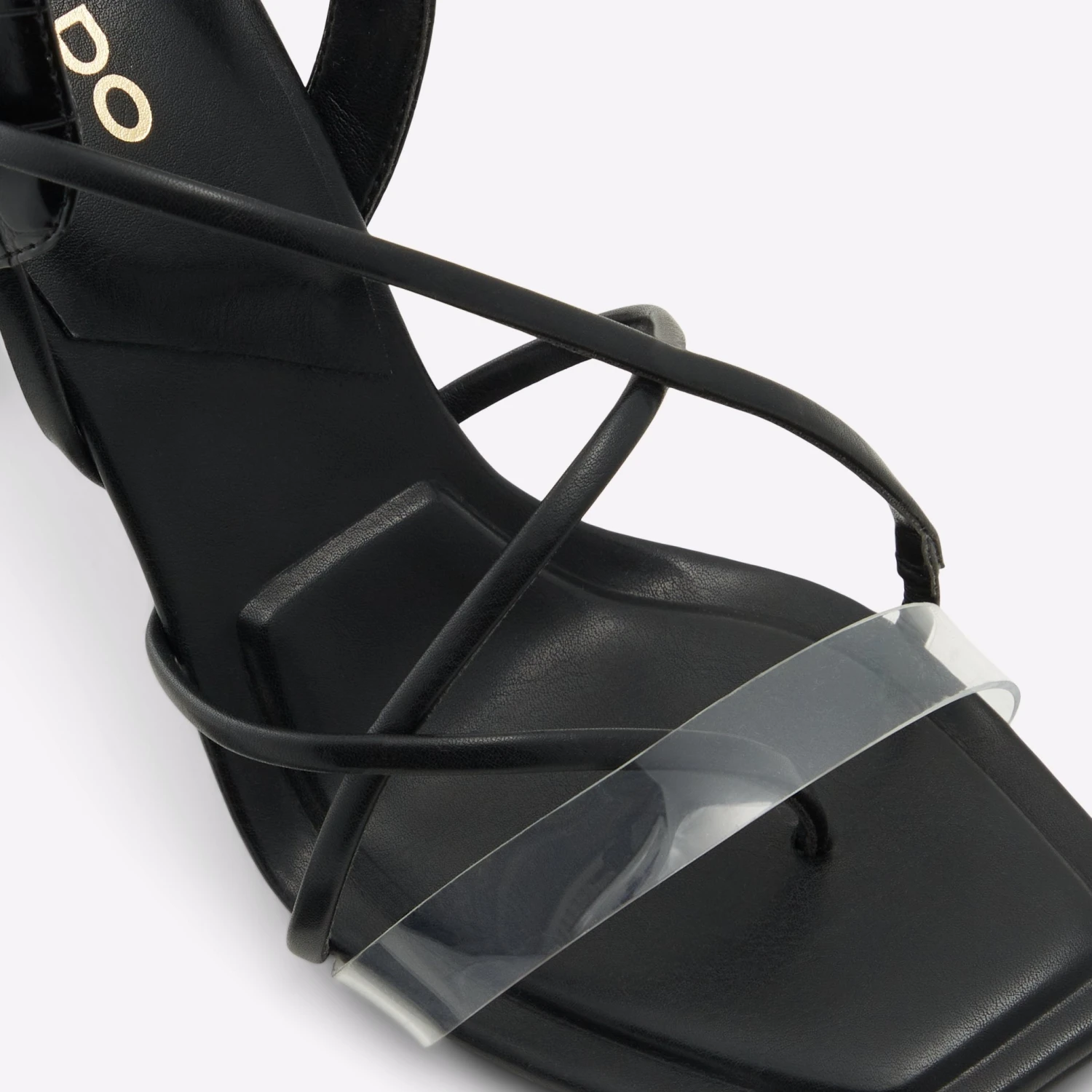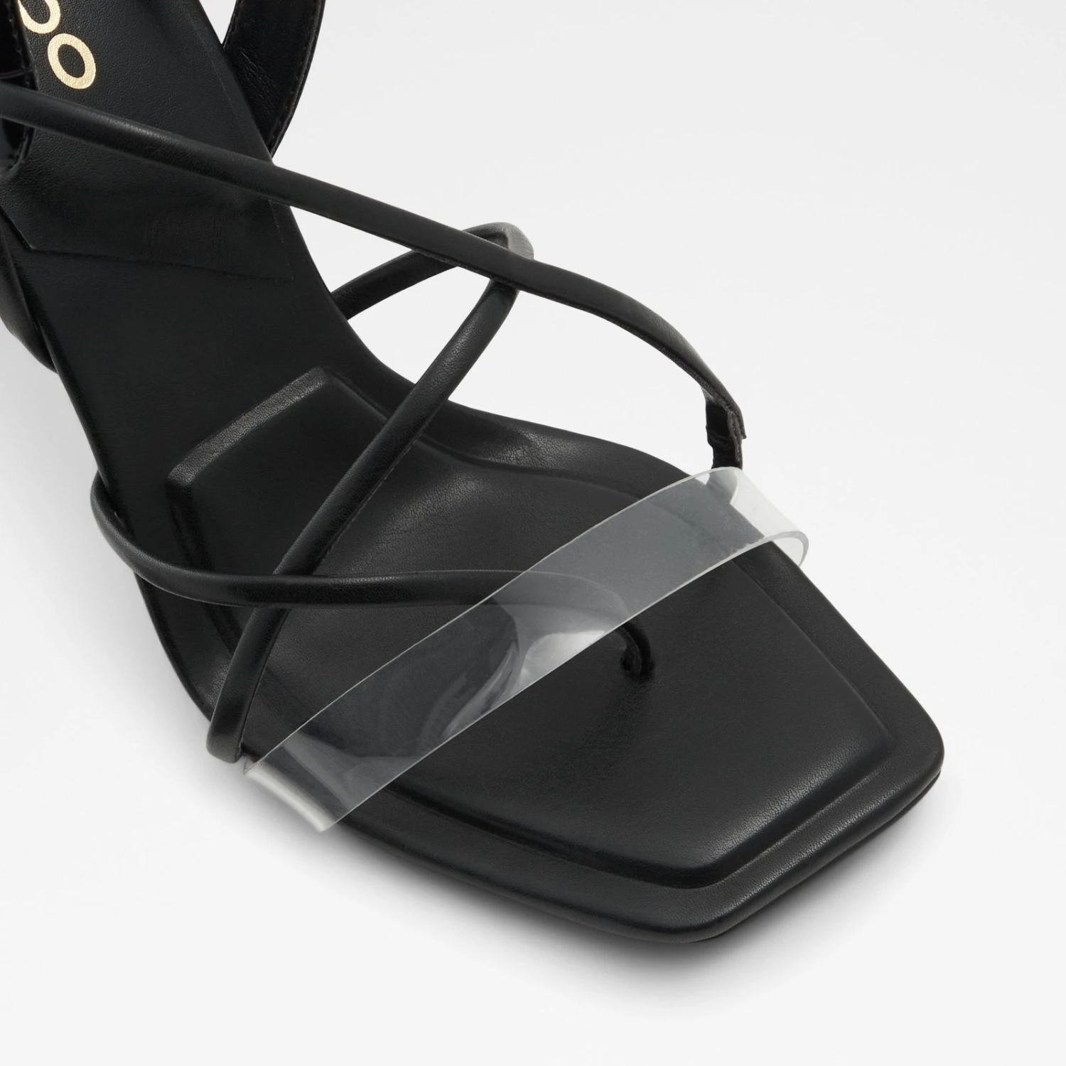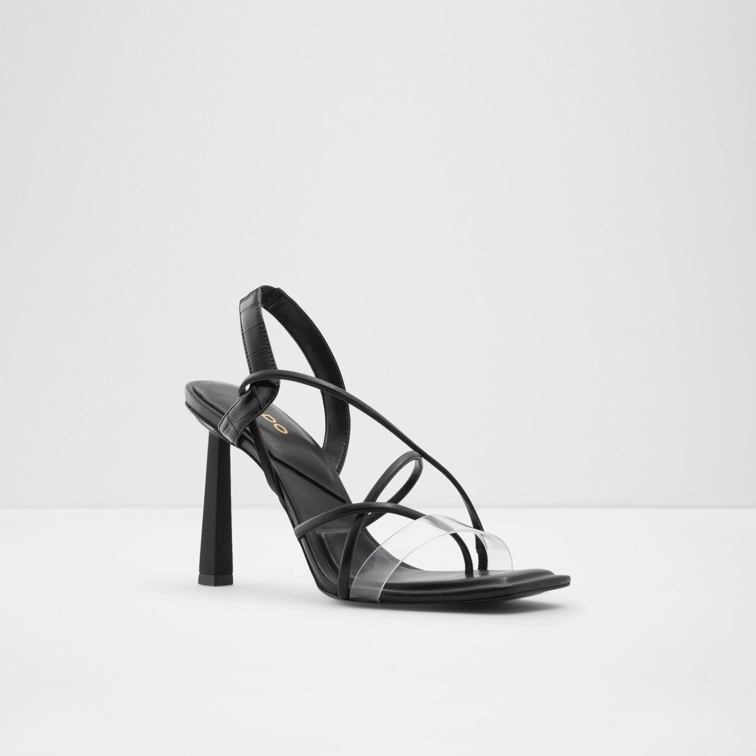 #Style notes *Sculpted heel and see through detailing add major flair to these strappy square toe heels. Designed for all day comfort thanks to its XX, these heels were made for walking! #Details * Thong sandal * Square toe * Slip on * Colour Black #Materials *Upper: Synthetic *Main: Smooth *Sole: Rubber #Measurements *Heel height: 3.75 inches