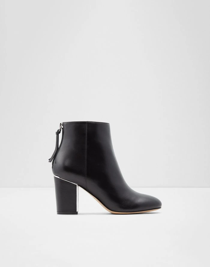 #Style notes *We added a block heel and round toe design to this chic ankle boot. The modern silhouette and slim fit is pretty versatile and easy to pair up with your entire wardrobe. #Details * Ankle boot * Round toe * Block heel * Zipper closure * Colour Black #Materials *Upper: Leather *Main: Smooth *Sole: Rubber #Measurements *Heel height: 3.25 inches *Shaft Height: 4.75 inches