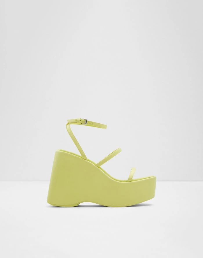 #Style notes *Bold platform sandals with a barely-there strappy finish. Our trendy vegan leather Kasie wedges are delivering a major style boost to your OOTD.#Details * Strappy wedge sandal #Details * Strappy wedge sandal * Open almond toe * Wedge heel * Buckle closure * Colour Medium Yellow #Materials *Upper: Satin *Main: Textile *Sole: Rubber #Measurements *Heel height: 11.4 cm *Platform height: 5.0 cm