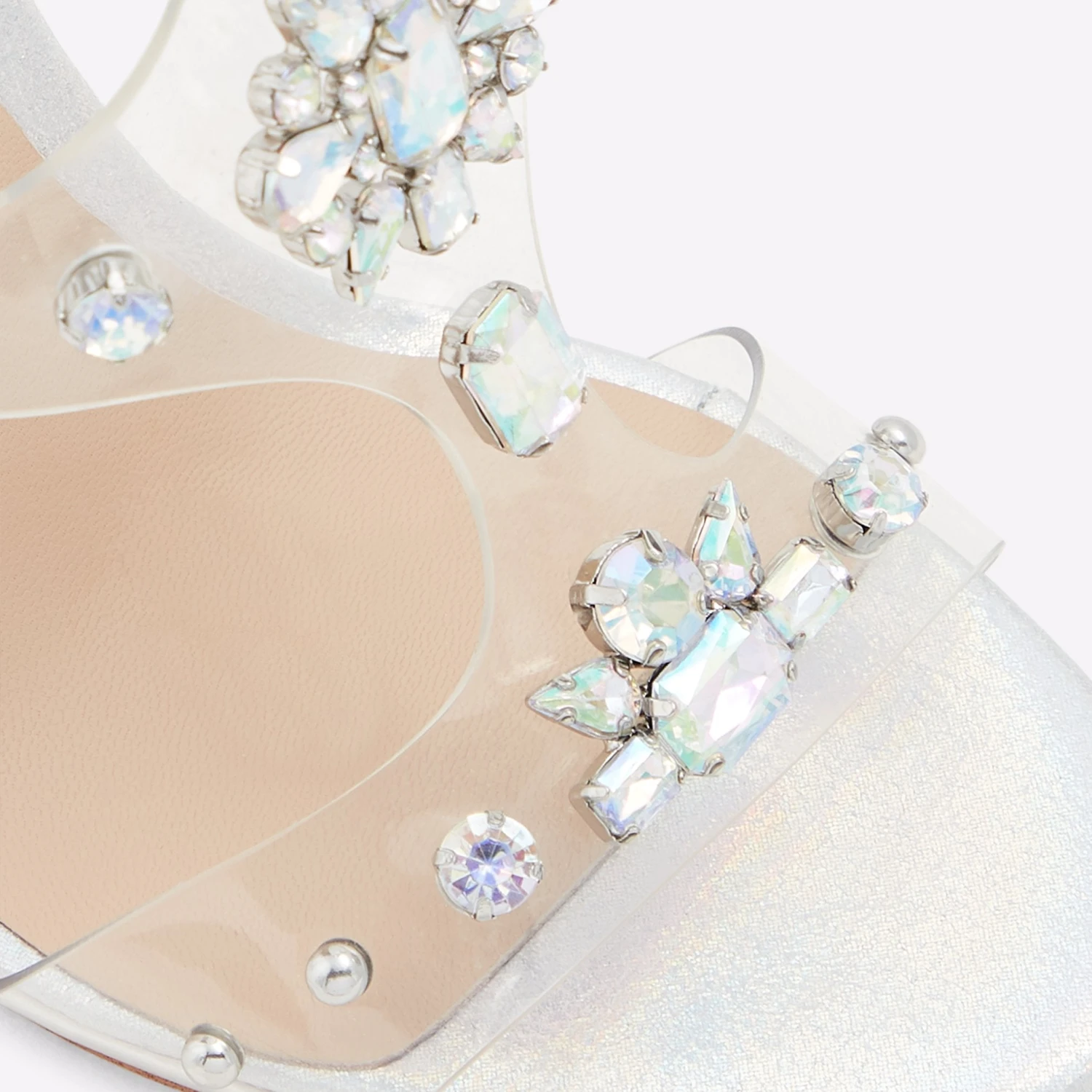 #Style notes *A style worthy of a princess, but made for a Queen, this ultra-glam t-strap sandal will be the belle of the ball. Rhinestone strung straps and a collared heel ensure balance and poise in every step. Zippered heel offers slide on ease. #Details * Caged high heel * Round toe * Stiletto heel * Zipper closure * Rhinestone embellishment * Colour White #Materials *Upper: Synthetic *Sole: Rubber #Measurements *Heel height: 11.0 cm