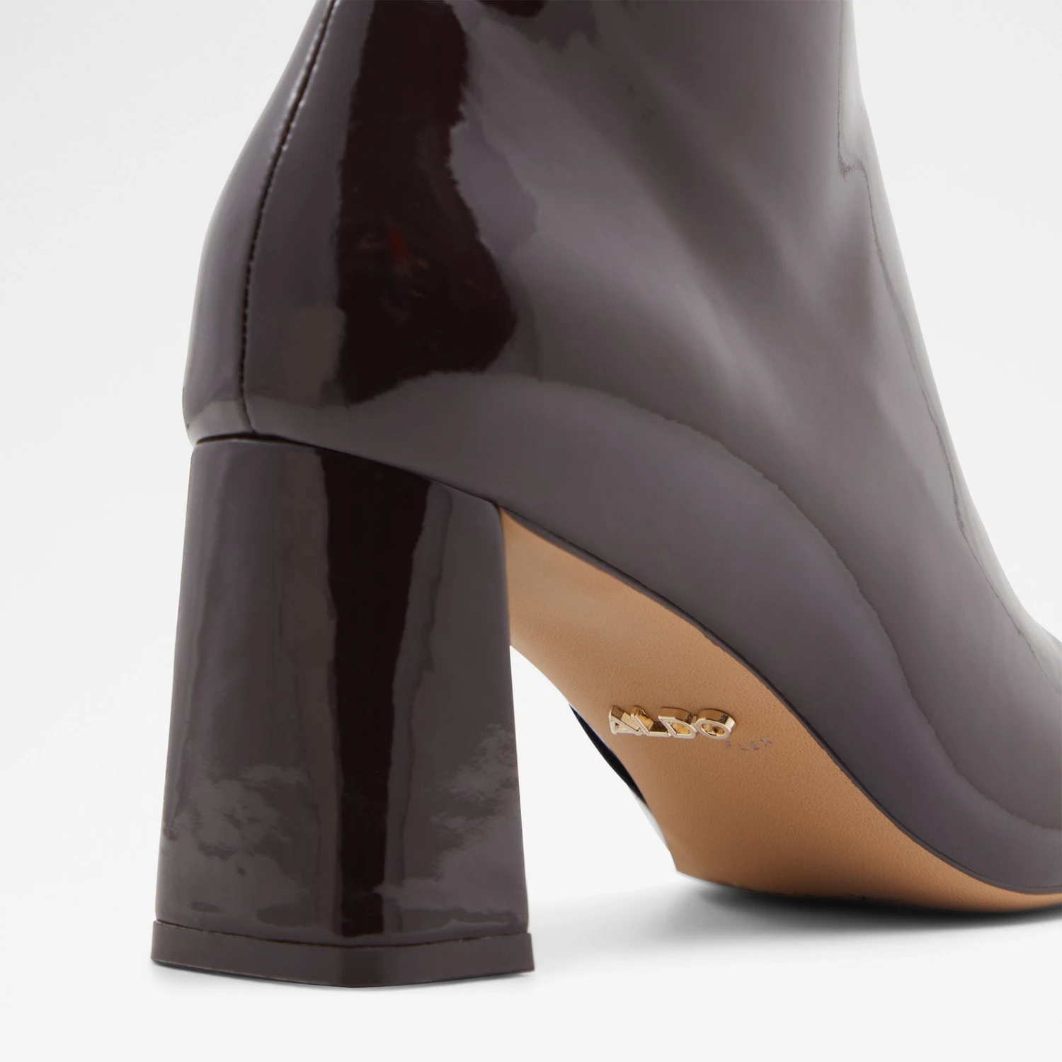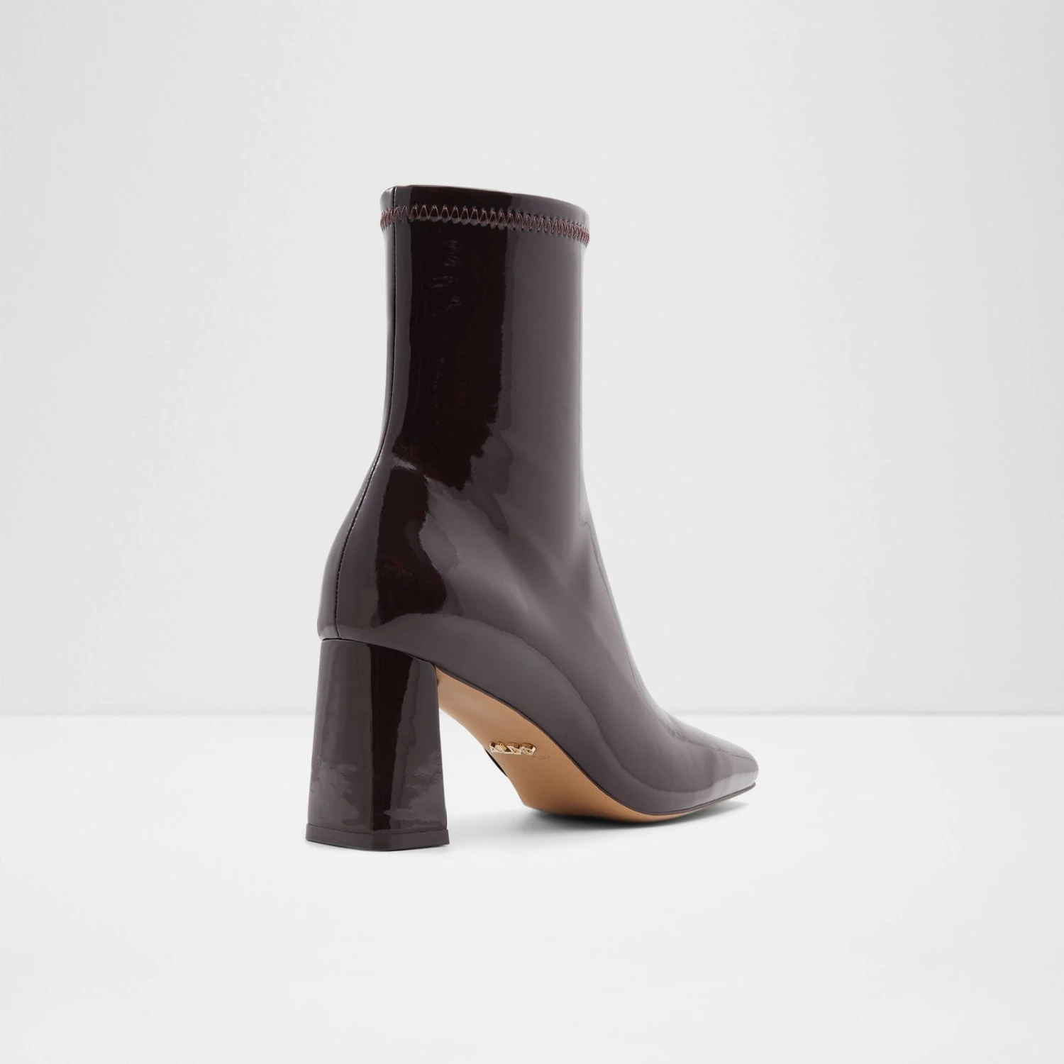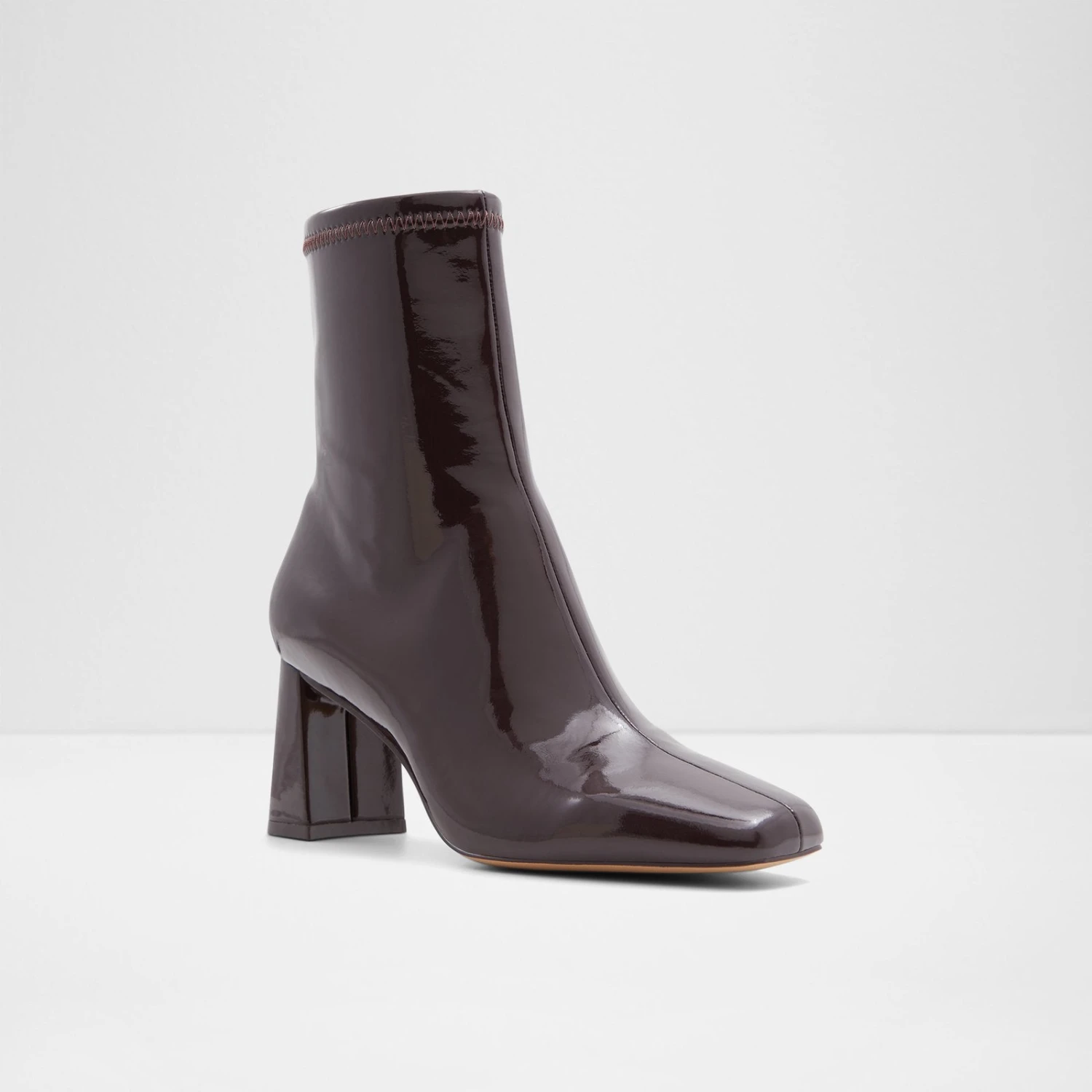 #Style notes *Sculpted block heel and trend-right square toe make these everyday booties a wardrobe staple. #Details * Ankle boot * Closed round toe * Slip-on * Colour Dark Brown #Materials *Upper: Synthetic *Main: Patent *Sole: Rubber #Measurements *Heel height: 3.0 cm