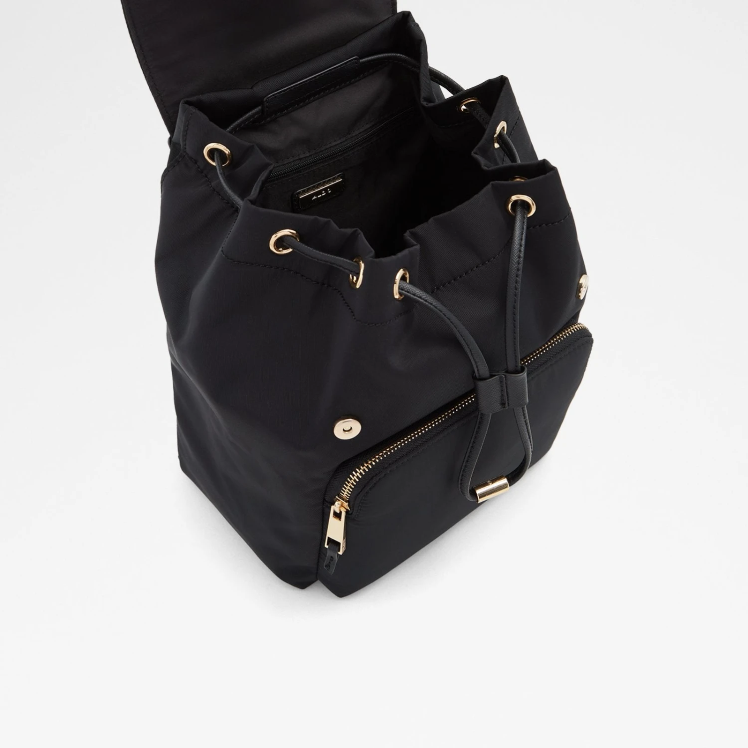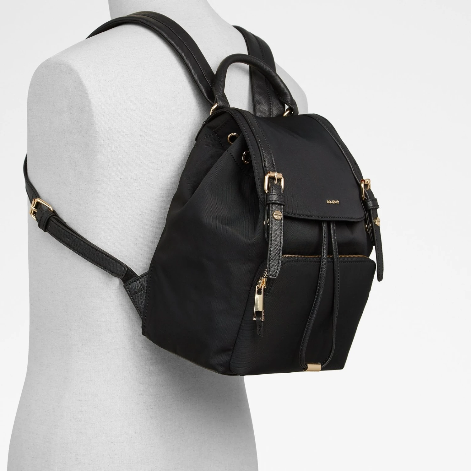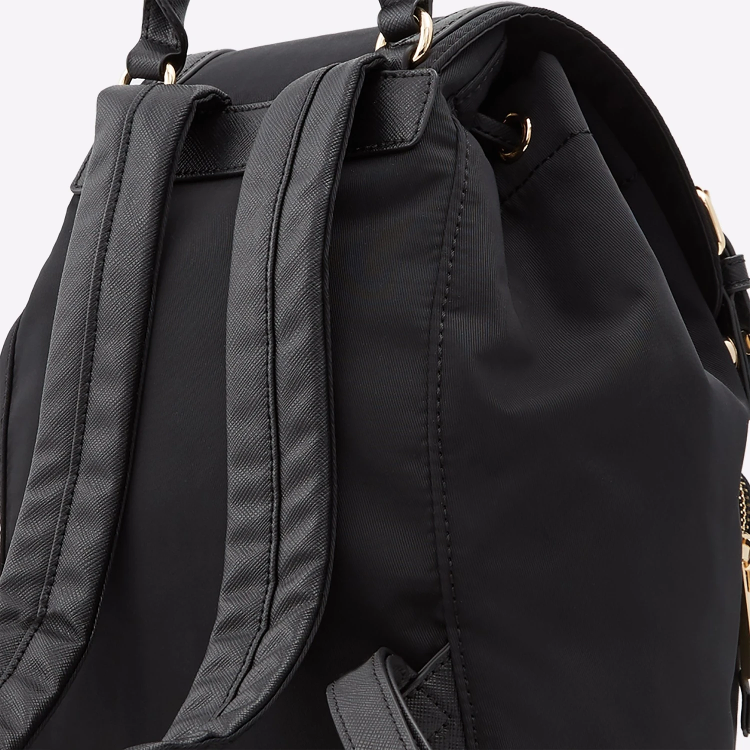 Designed with waterborne polyurethane, a material manufactured in a way that uses fewer chemical solvents, energy and water, Rella is a sustainable backpack that knows how to carry itself. Its exterior shell and lining are crafted with nylon-type textile made out of recycled plastic bottles, representing 16 water bottles kept out of landfills and 2,940 grams of carbon dioxide prevented from entering the atmosphere. #Details * Backpack * Magnetic snap closure * Decorative buckle * Interior compartment * Colour Black #Materials *Main: Synthetic *Lining: Recycled Nylon #Measurements *Handle Drop Lenght: 10.0 cm *Strap Drop Length: 53.0 cm