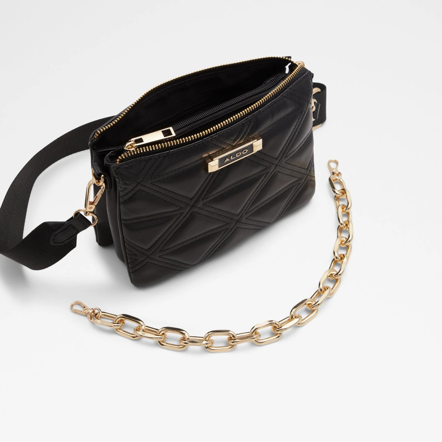 #Style notes * Cool cross body that can be doubled as a shoulder bag? What’s not to love. #Details * Crossbody bag * Zipper closure * Decorative chains * 3 interior compartments * Organizer * Two optional removable crossbody strap * Colour Black #Materials *Upper: Synthetic *Main: Mixed materials #Measurements *Strap Drop Length: 23.0 inches