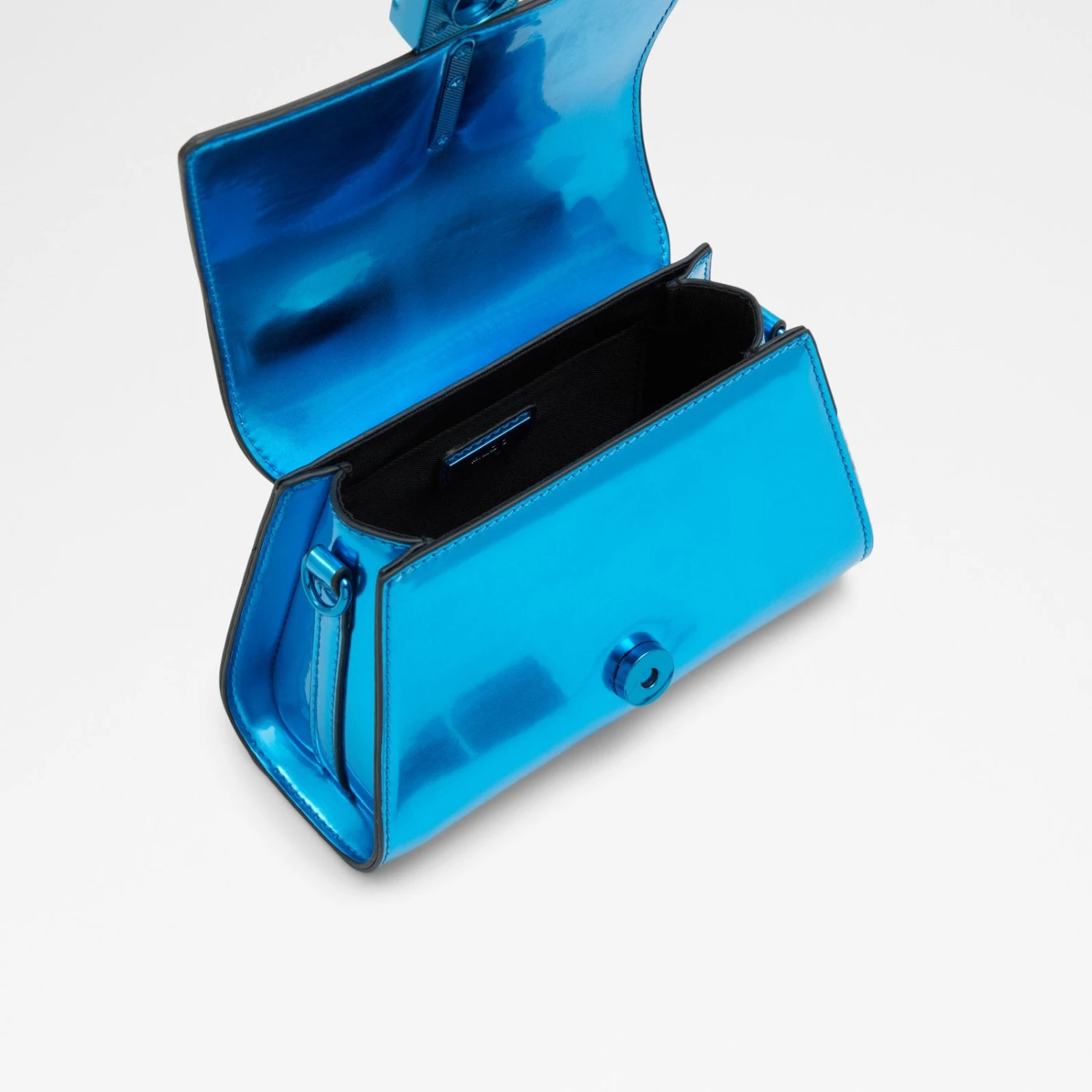 #Style notes *This statement top handle bag with standout metal hardware is the perfect complement to your bodycon dresses and high heels. #Details * Top handle bag * Magnetic snap closure * Metal lock detail * Interior compartment * Removable adjustable crossbody strap * Colour Medium Blue #Materials *Upper: Synthetic *Main: Metallic #Measurements *Handle Drop Lenght: 3.0 cm *Strap Drop Length: 23.0 cm