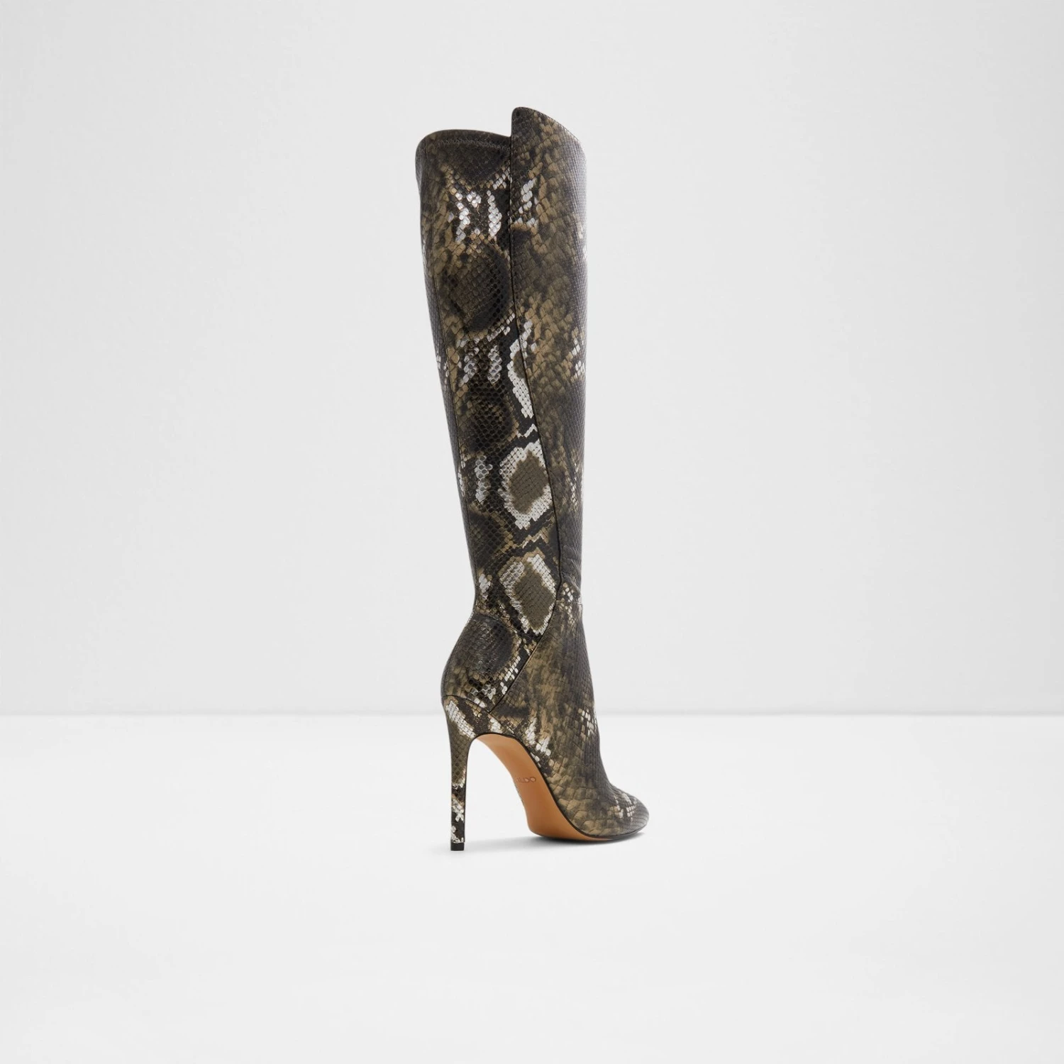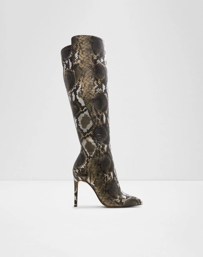 #Style notes *We a-do-re these high boots with a pointy toe! They will instantly revitalize some classic outfits that needed a little boost. #Details * Knee-high boot * Closed pointy toe * Stiletto heel * Zipper closure * Colour Khaki #Materials *Upper: Synthetic *Main: Snake skin *Sole: Rubber #Measurements *Heel height: 4.0 cm *Shaft Height: 13.0 cm *Circumference: 13.0 cm