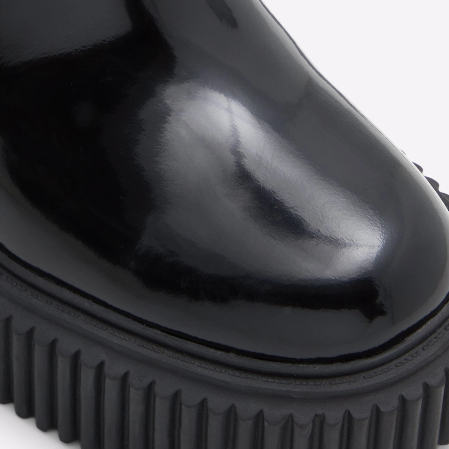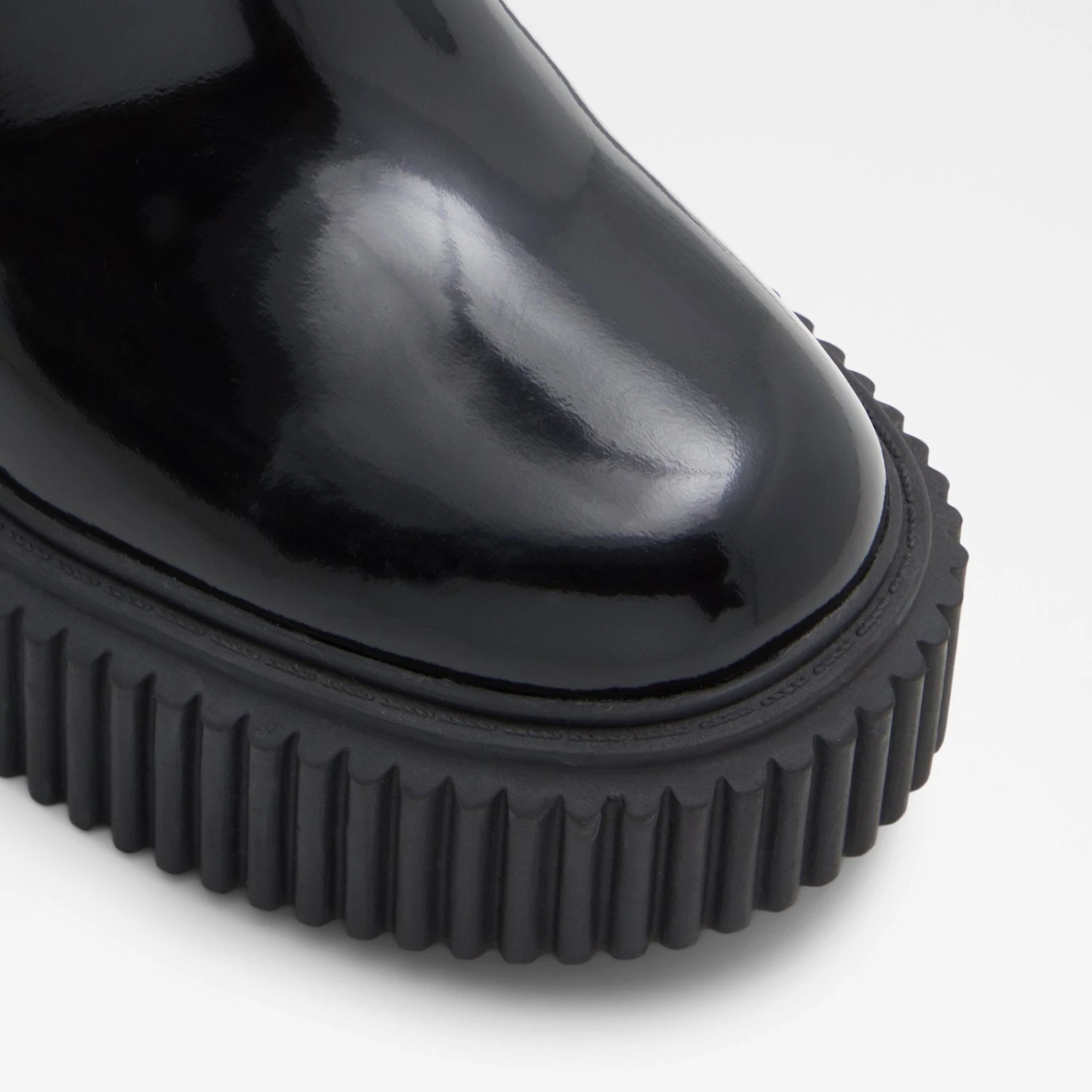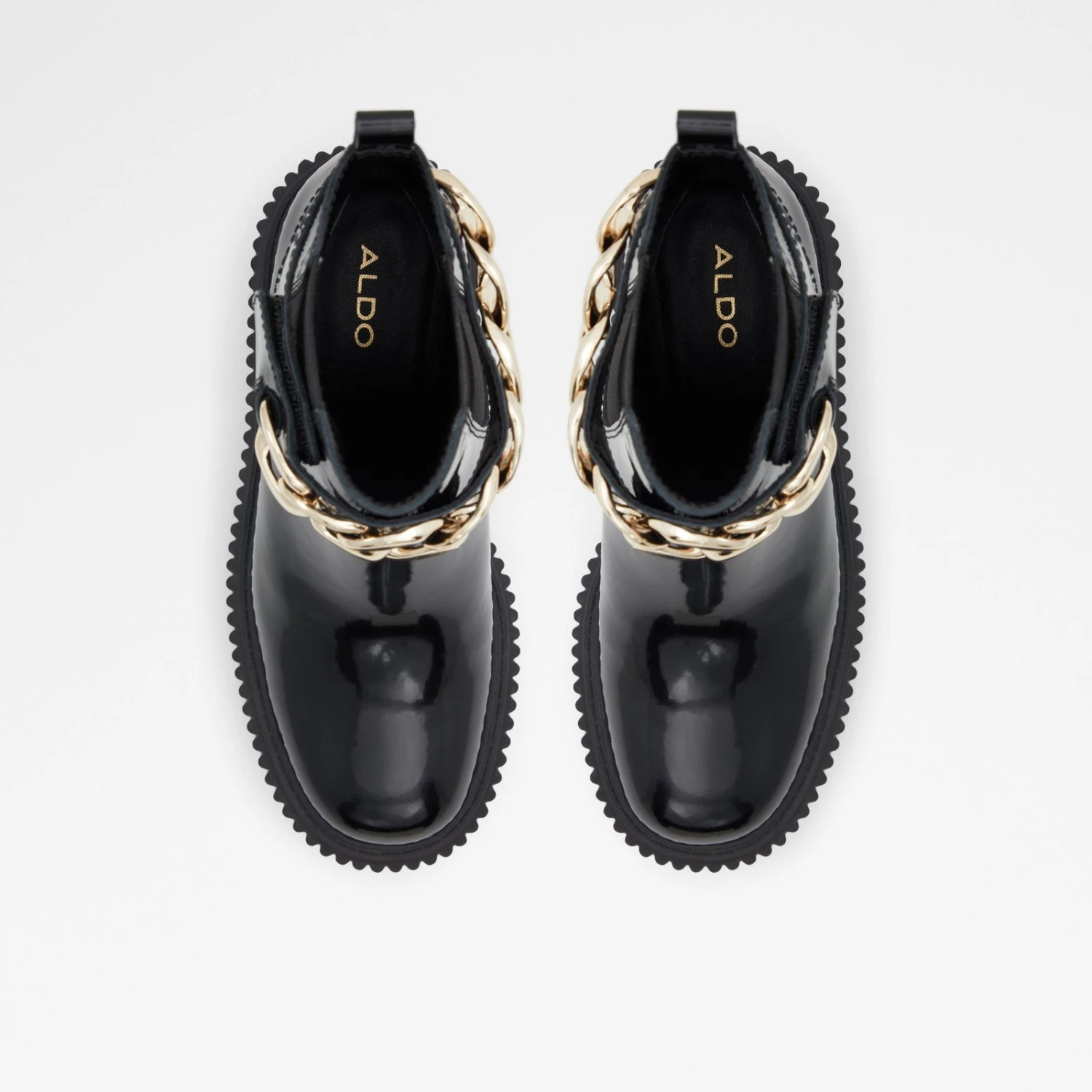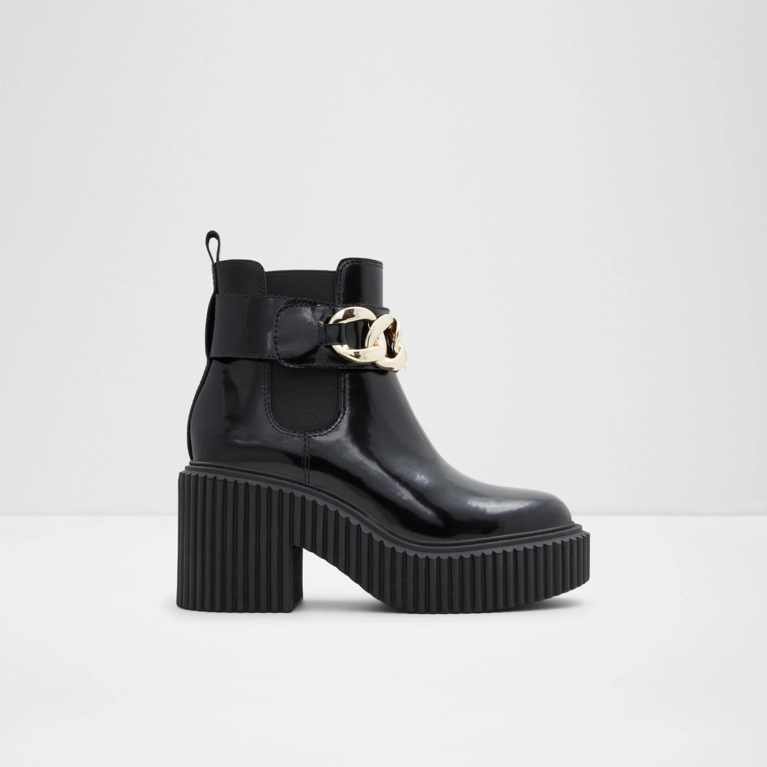 #Style notes *Make a bold entrance with these standout ankle boots grounded on extra chunky ribbed outsoles. #Details * Chelsea boot * Closed round toe * Lug sole * Slip-on * Decorative chains * Colour Black #Materials *Upper: Leather *Main: Shiny *Sole: Rubber #Measurements *Heel height: 3.5 cm *Platform height: 1.5 cm *Shaft Height: 4.5 cm