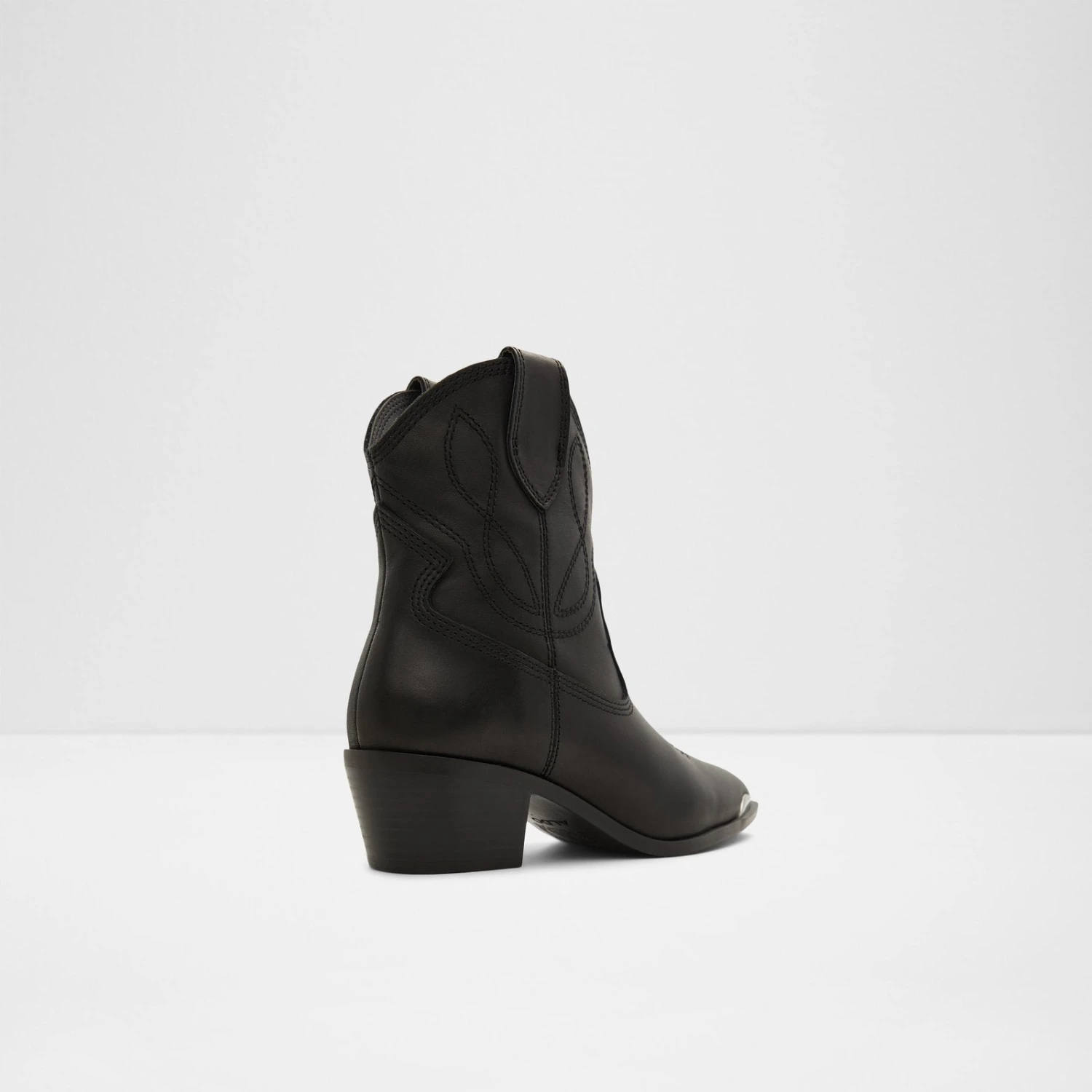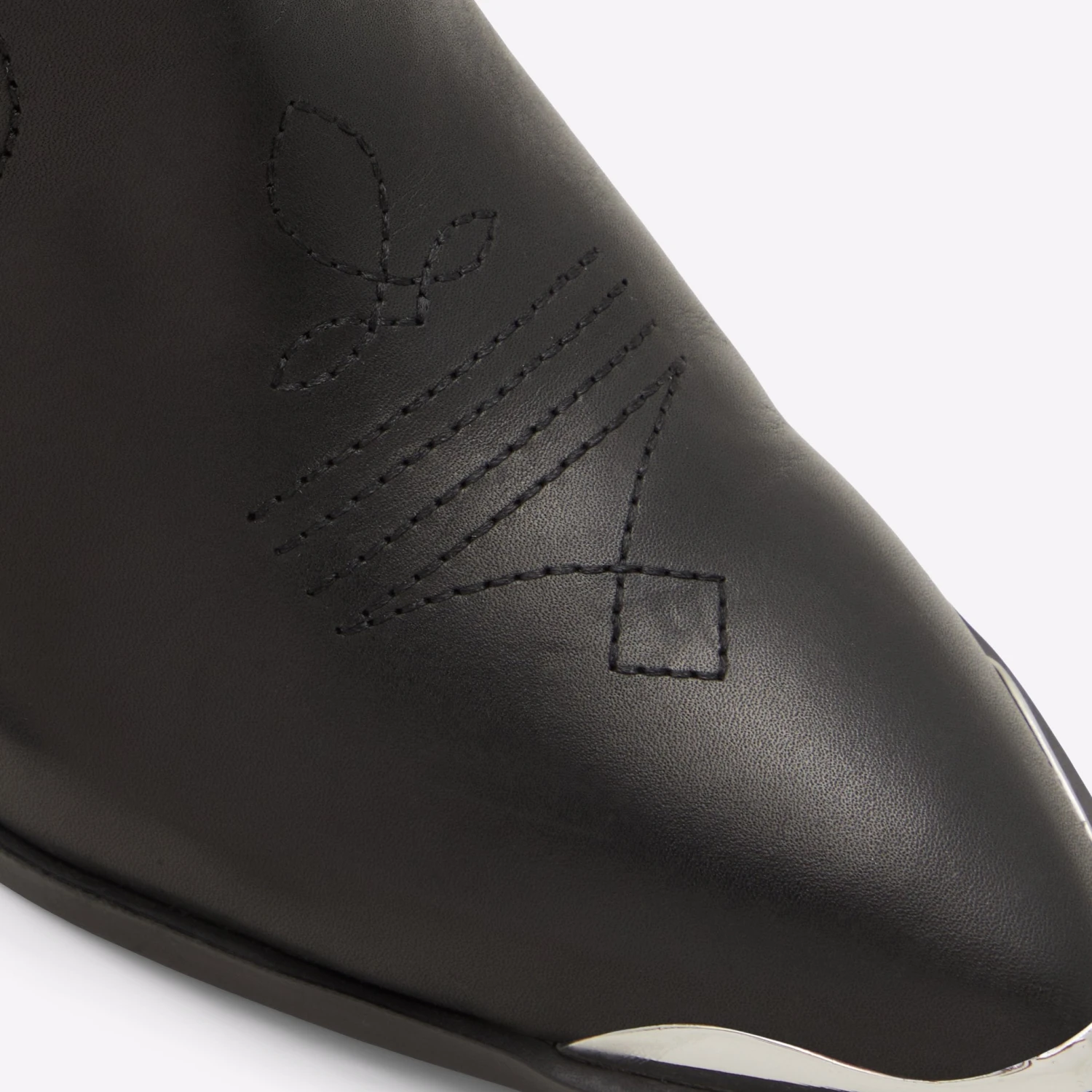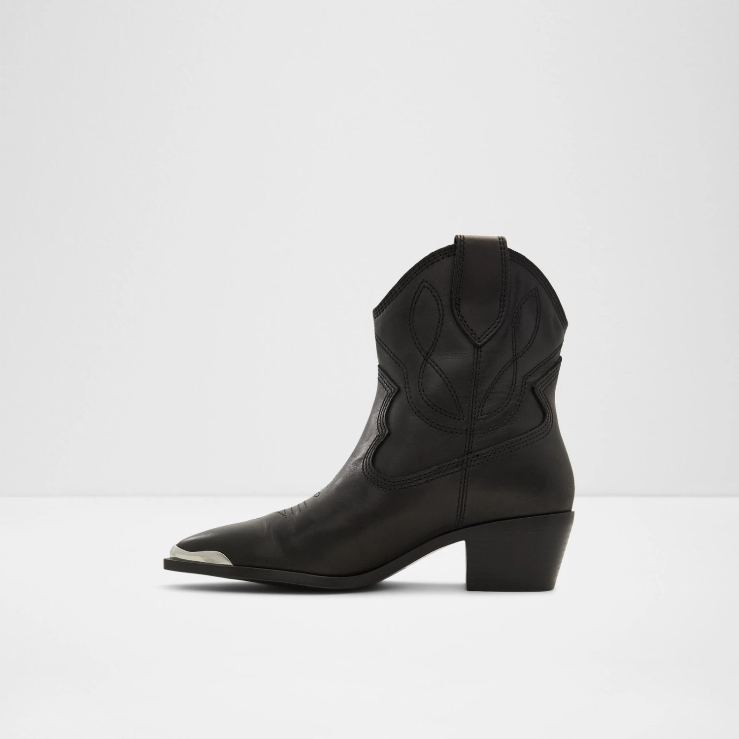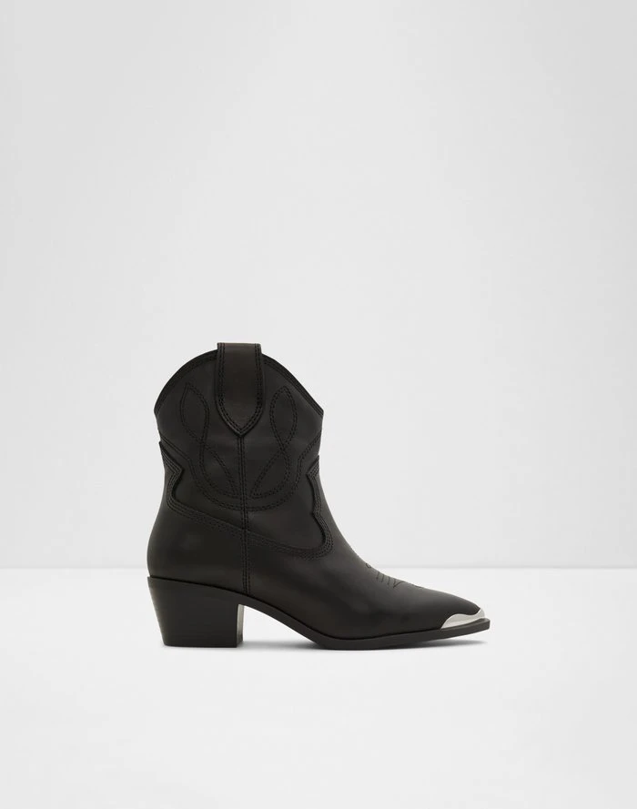 #Style notes * Channel your inner cowgirl in this seasons hottest trend. #Details * Western boot * Closed pointy toe * Block heel * Slip on * Cap toe * Colour Black #Materials *Upper: Leather *Main: Smooth *Sole: Rubber #Measurements *Heel height: 2.0 inches *Shaft Height: 6.0 inches