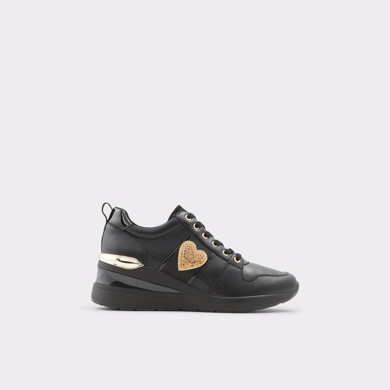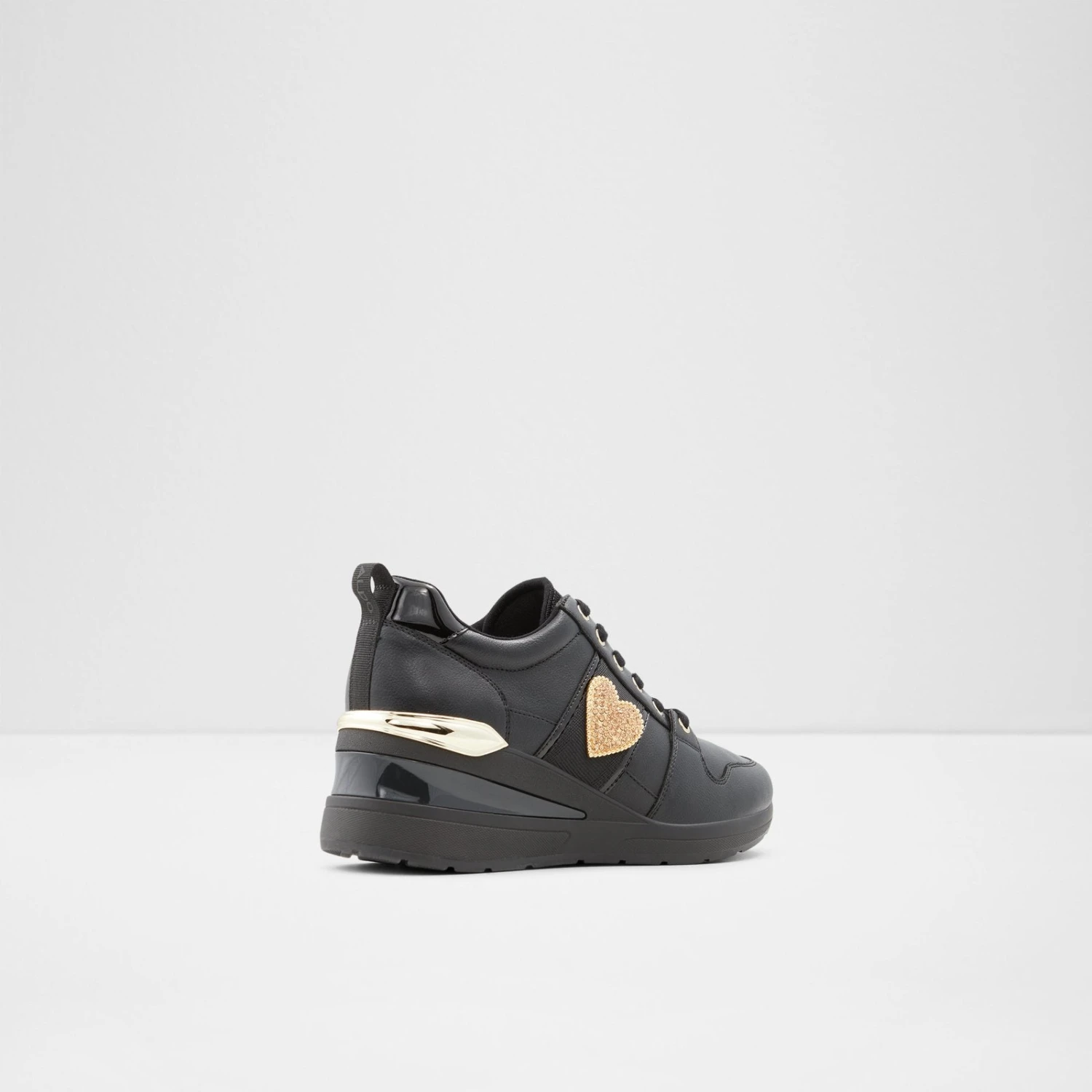 #Style notes *Can you feel the love with these casual sneakers with heart-shaped patches? We certainly can! Pair them with vibrant reds and fun outfits and get ready to turn heads! #Details * Sneaker * Round toe * Wedge heel * Laces closure * Patches detail * Colour Black #Materials *Upper: Synthetic *Sole: Rubber #Measurements *Heel height: 7.0 cm